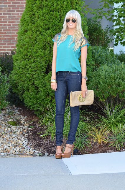Top- Marshall’s/ Jeans- Forever 21 here/ Shoes- Nordstrom/ Clutch- Tory Burch here/ Bangle-Forever 21/ Watch- Michael Kors here/ Sunglasses- Ray-Ban’s here