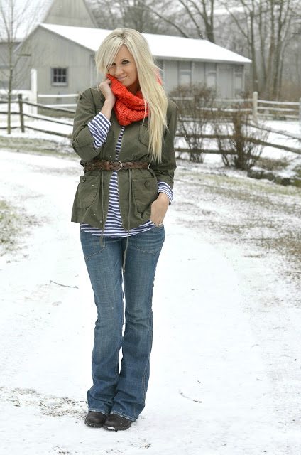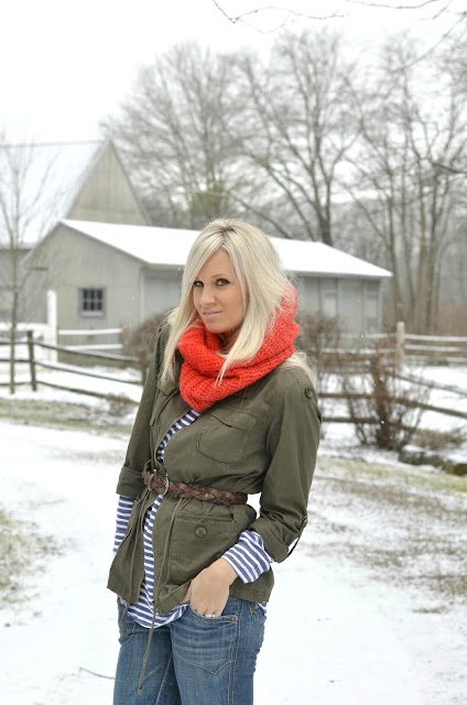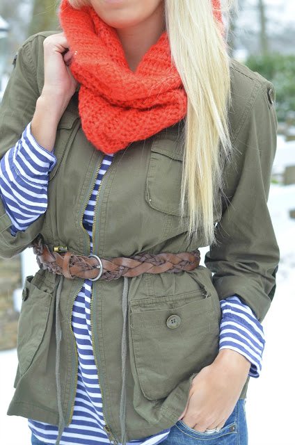 What a cute look! Love the stripes under that military jacket, and that scarf is so cozy π