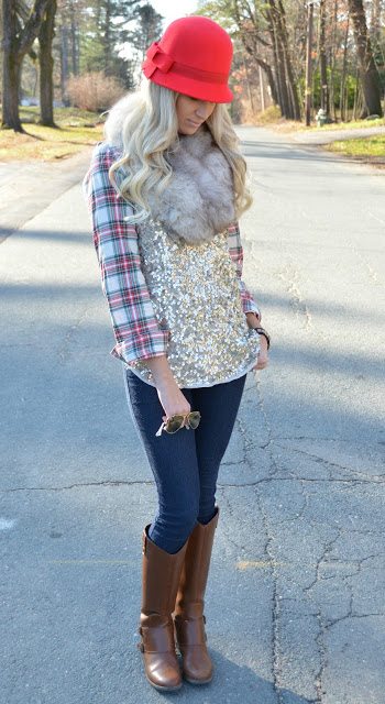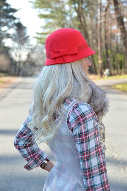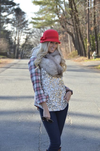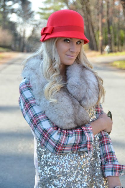 There is just a mix of everything fabulous in this outfit! Love the fur, the sparkles and the plaid. The hat is just icing on the cake. You look gorgeous!