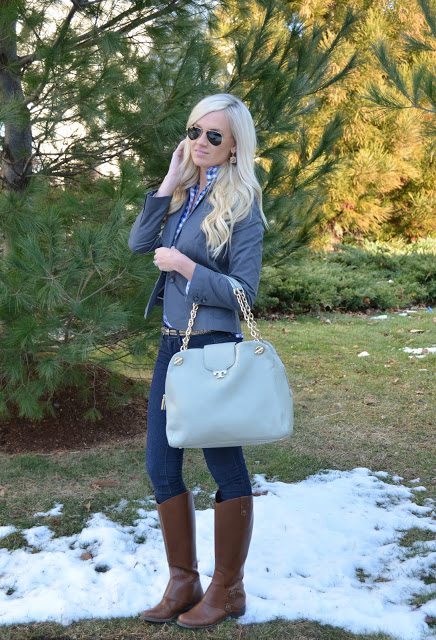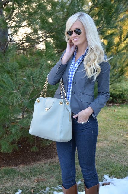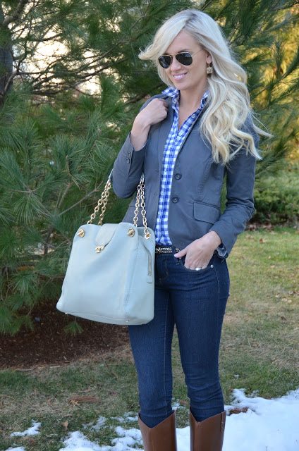 Top- Gap Outler (old) similar/ Blazer- Gap Outlet (old) similar / Jeans- Forever21/ Boots- Target buy here/ Belt- Old Navy buy here/ Earrings- Loft/ Sunglasses- Ray- Ban’s buy here/ Bag (gift) – Tory Burch buy here