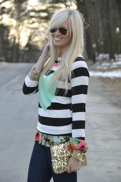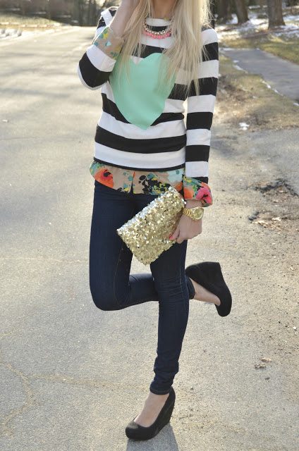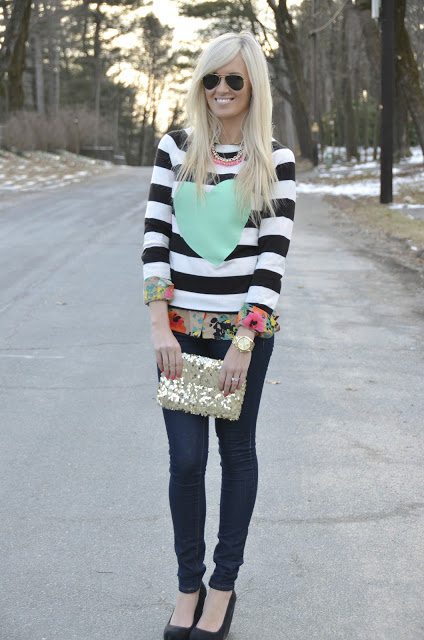 Loving the mixed prints and heart/striped sweater!