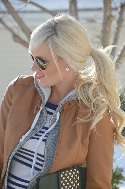 obsessed with the layering going on here (not to mention your phone case, clutch, and beautiful hair). the stripes, caramel leather and grey hoodie all pairs perfectly with the distressed jeans and converse. great spring casual look! xo