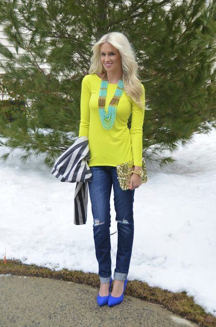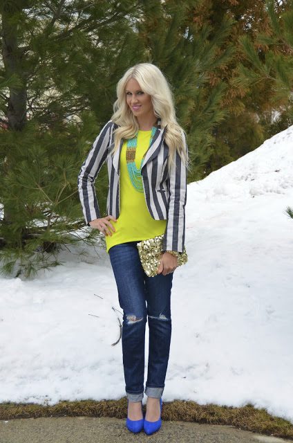 Love the bright neon with the striped blazer! SO gorgeous!
