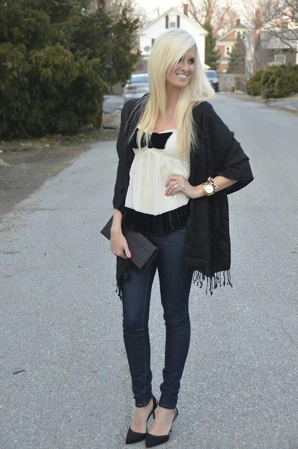 Top- loving this one / Shawl- Nordstrom Rack similar / Jeans- Forever 21 buy here/ Shoes- Zara similar / Clutch- Vintage(my grandmothers) similar / Watch- Michael Kors buy here/ Bracelet- Forever 21 similar