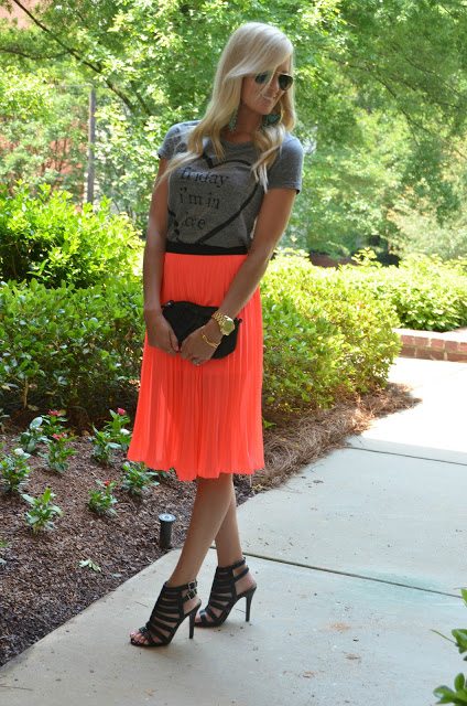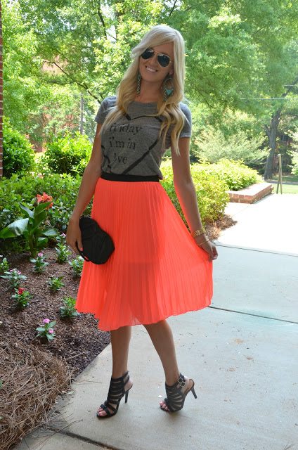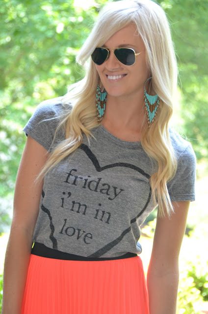 Adorable girl! That neon skirt is awesome and great color combo with the turquoise earrings! And that tee is too perfect:)