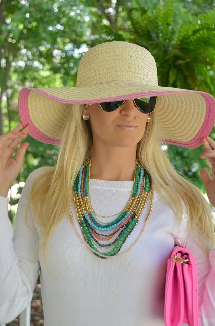 So chic girl! Love the pretty pops of pink in your hat and clutch!