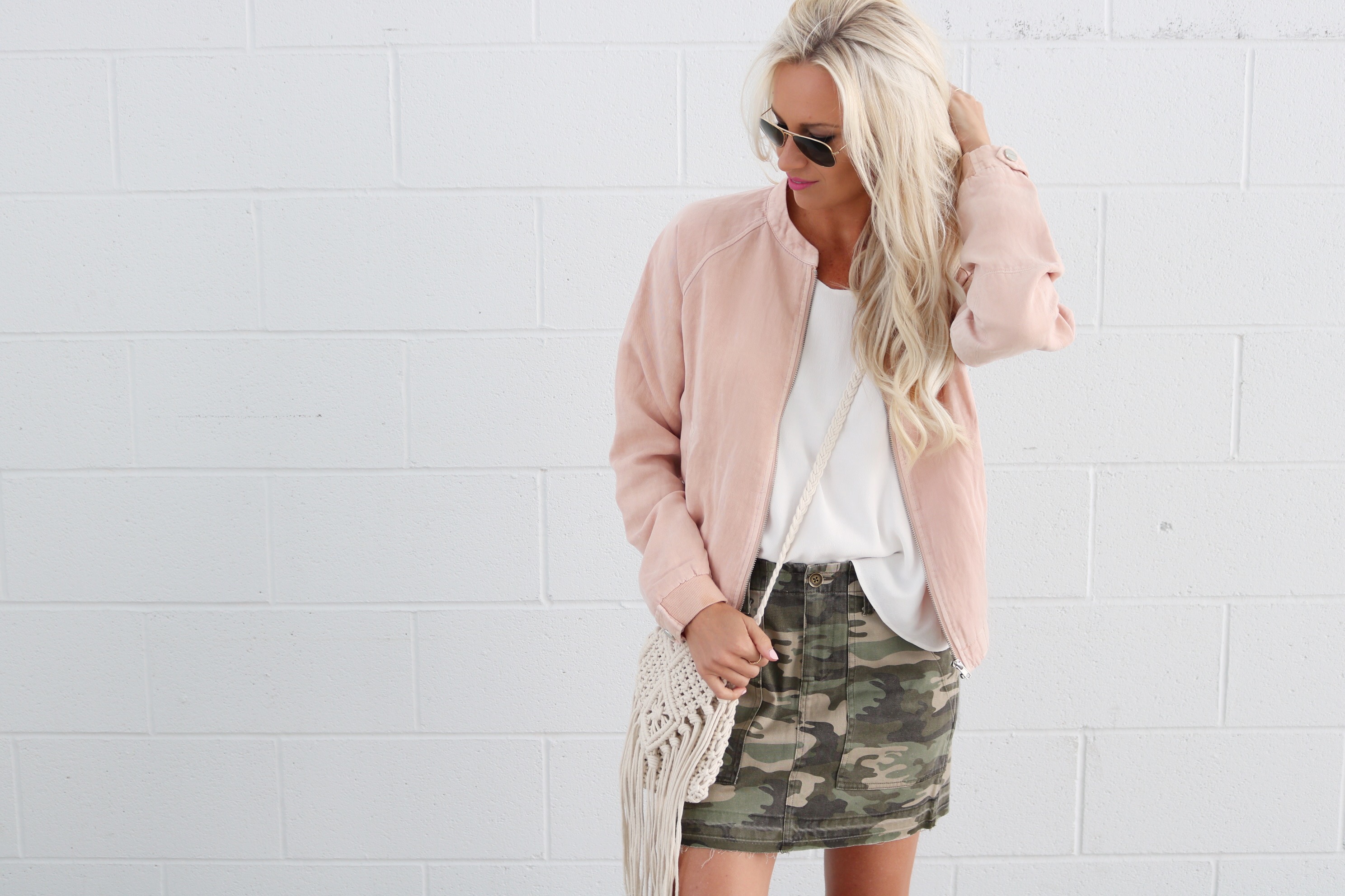 I never thought to style a blush bomber jacket with a camo skirt. Really like the look!