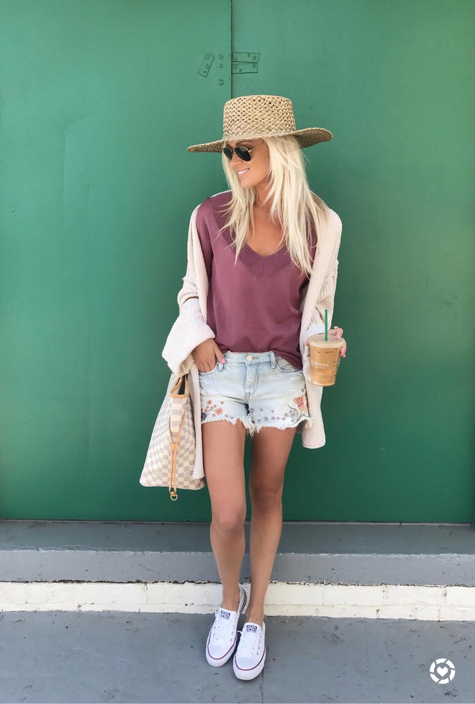 Cardigan: Free People | Top: Nordstrom | Shorts: Blacknyc| Shoes: Converse | Hat: San Diego Hat Company | Bag: Louis Vuitton | Sunglasses: Ray-Ban