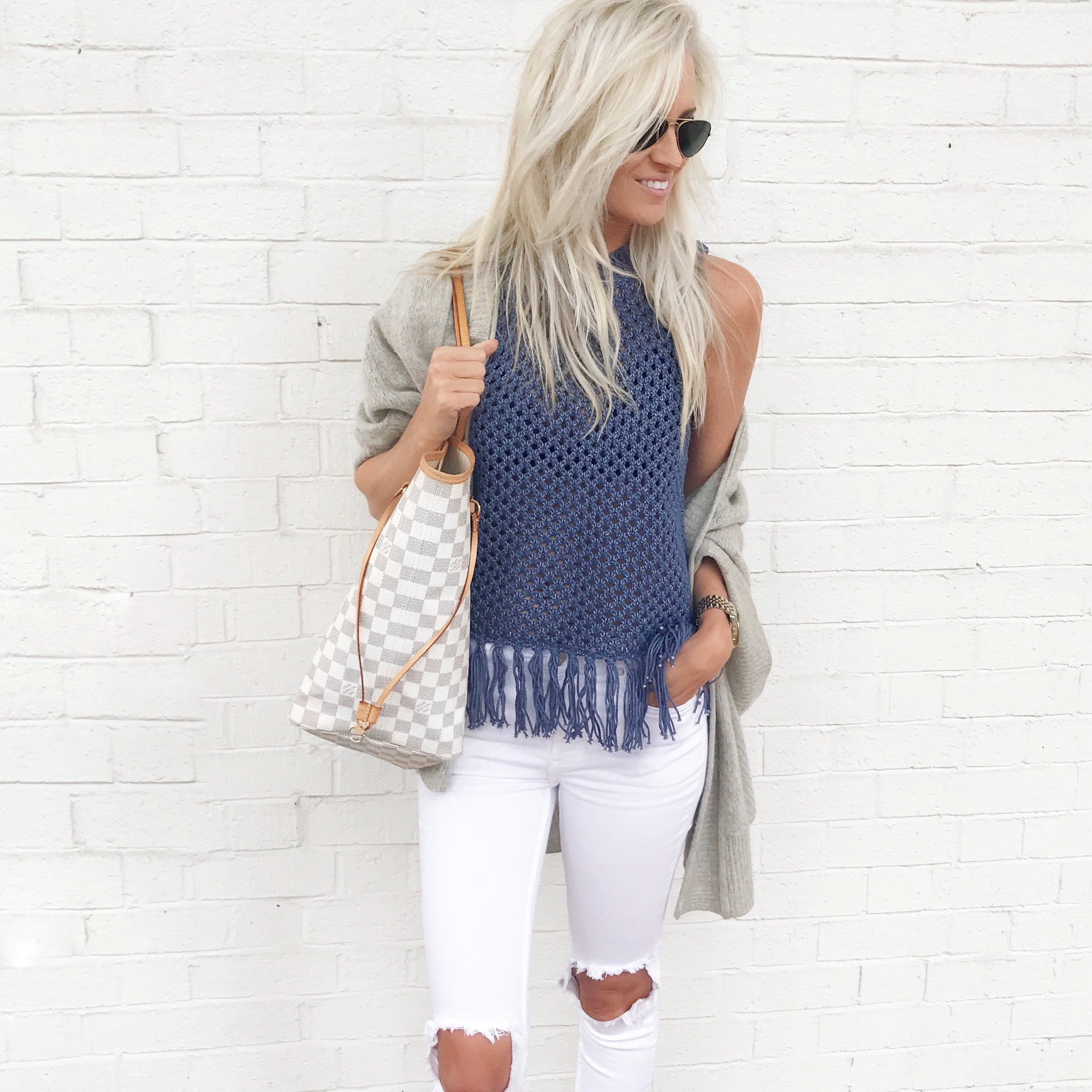 Cardigan: Nordstrom | Knit Tank: Urban Outfitters | Denim: Free People | Bag: Louis Vuitton | Sunglasses: Ray-Ban