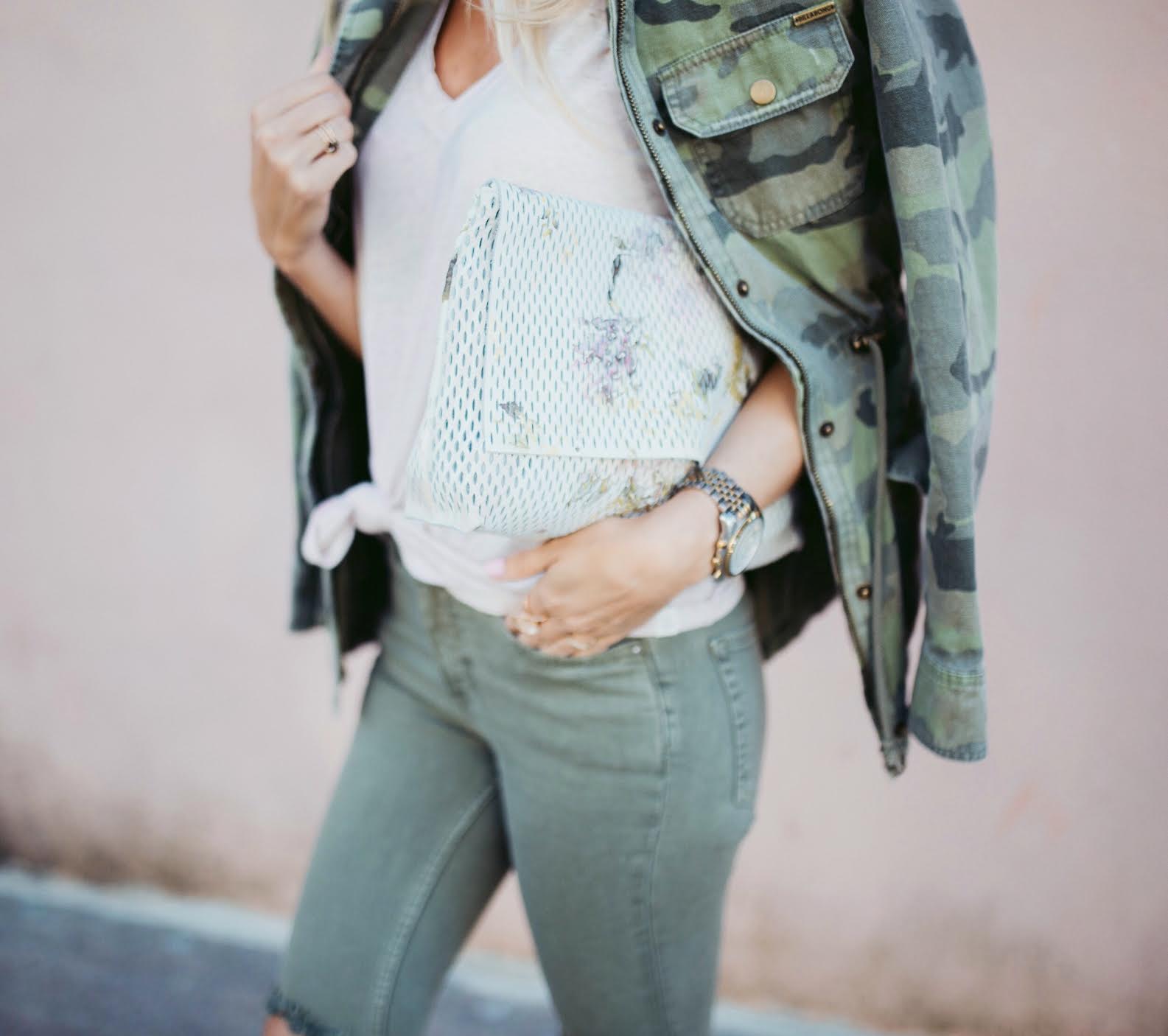 Camo Jacket: Nordstrom (similar) | Tee: Treasure&Bond | Denim: Free People | Clutch: Anthropologie