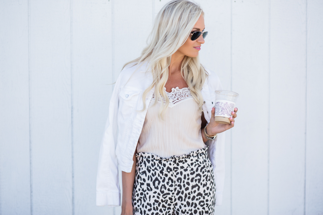 It’s love at first site! These leopard pants make my heart happy and my favorite new addition to my closet! This metallic tank is the perfect pair tucked in! Keeping the colors light and neutral, I paired with white denim jacket with the look! All of these pieces are at Nordstrom right now, along with the a bunch of cute new arrivals!