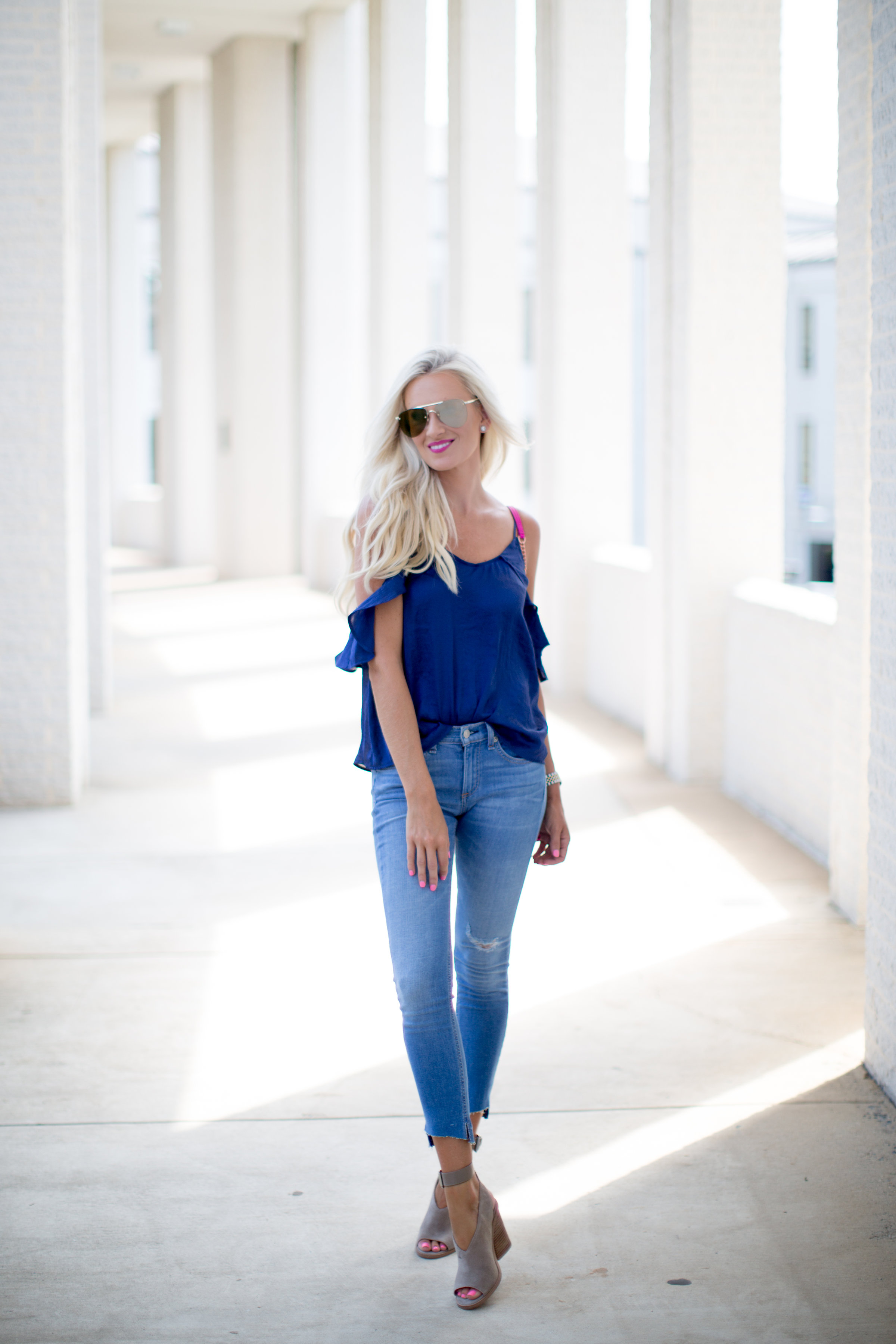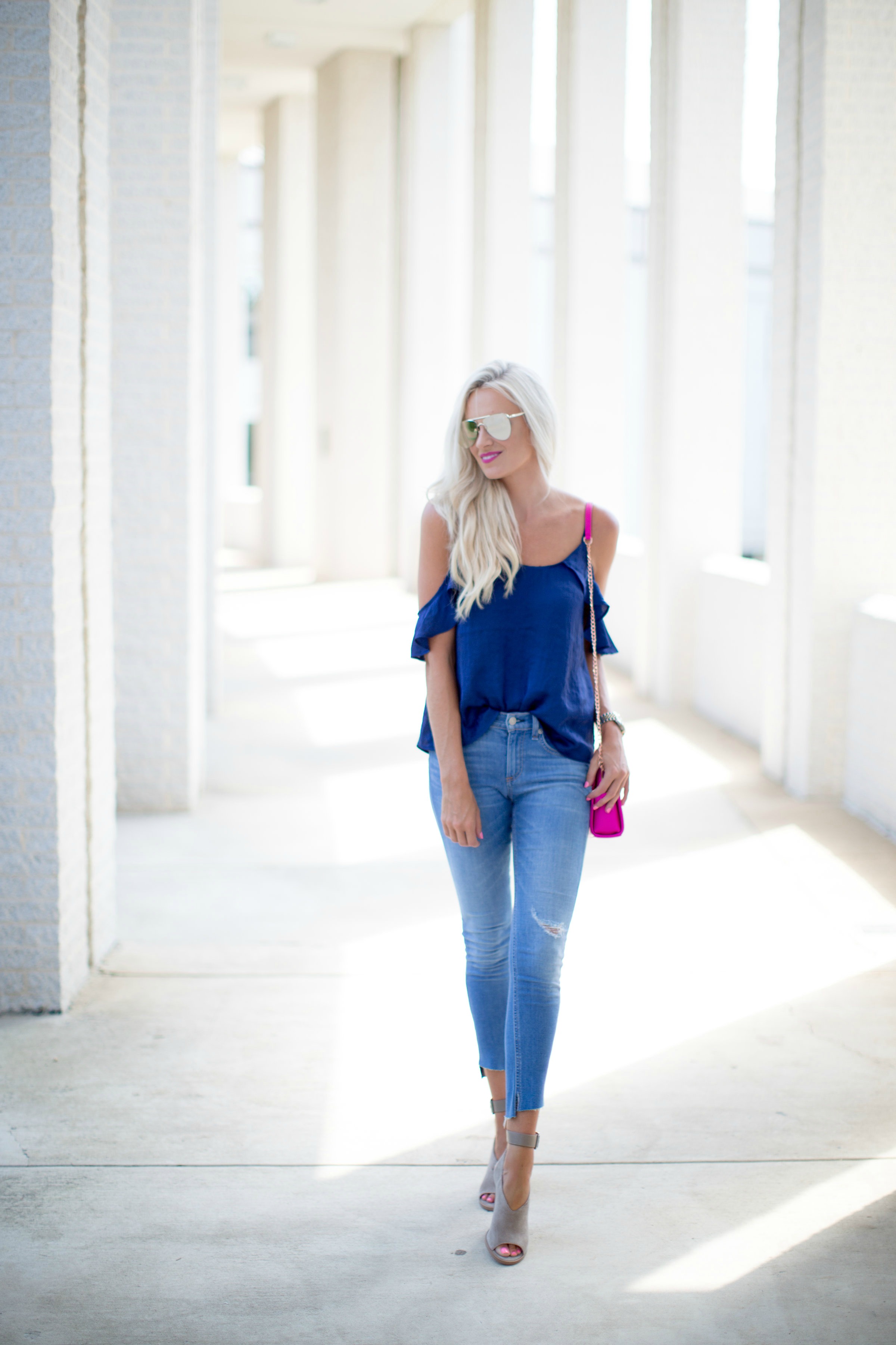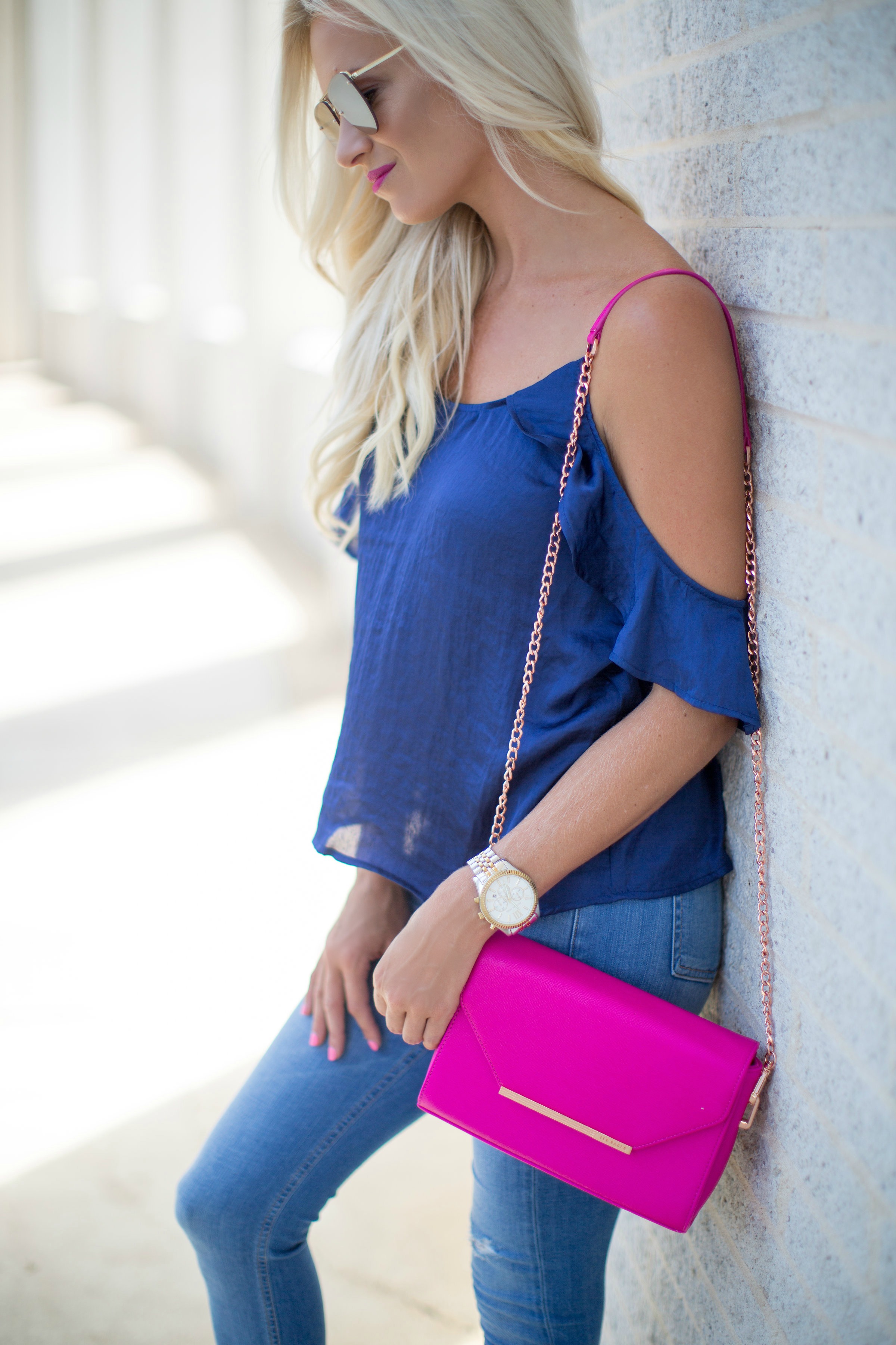 That blue looks so pretty with your blonde hair!! Love the bright pink bag too!