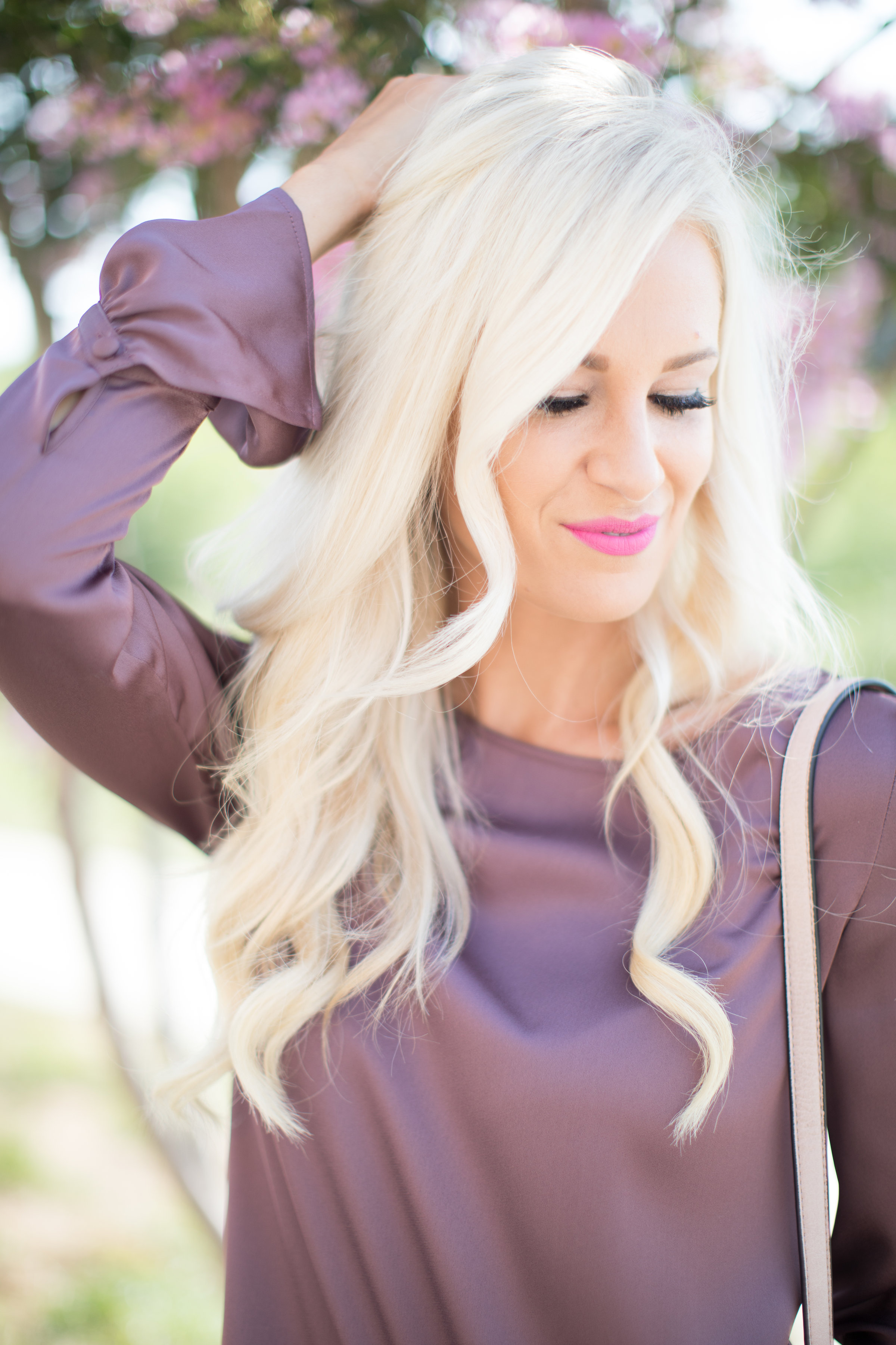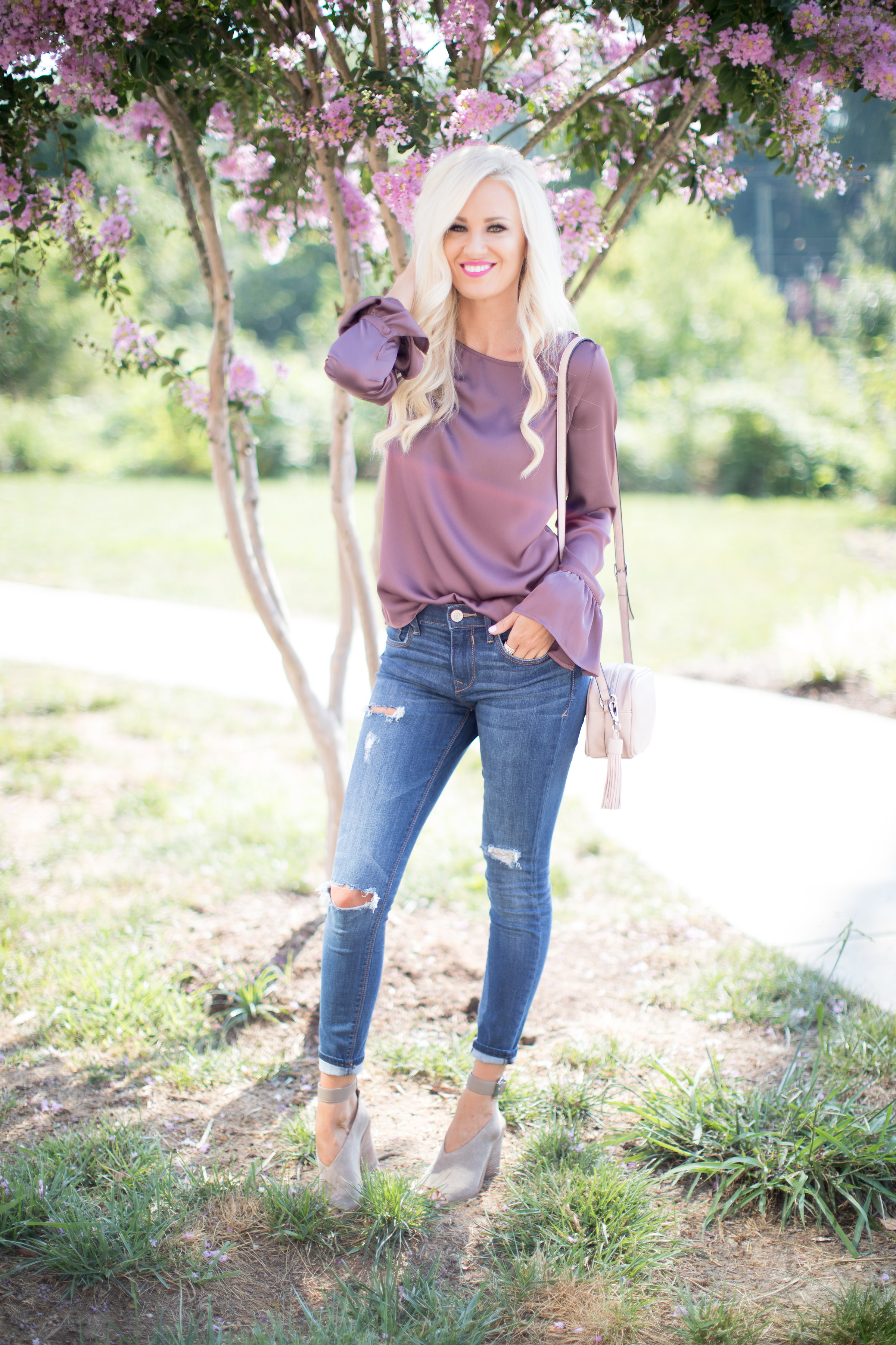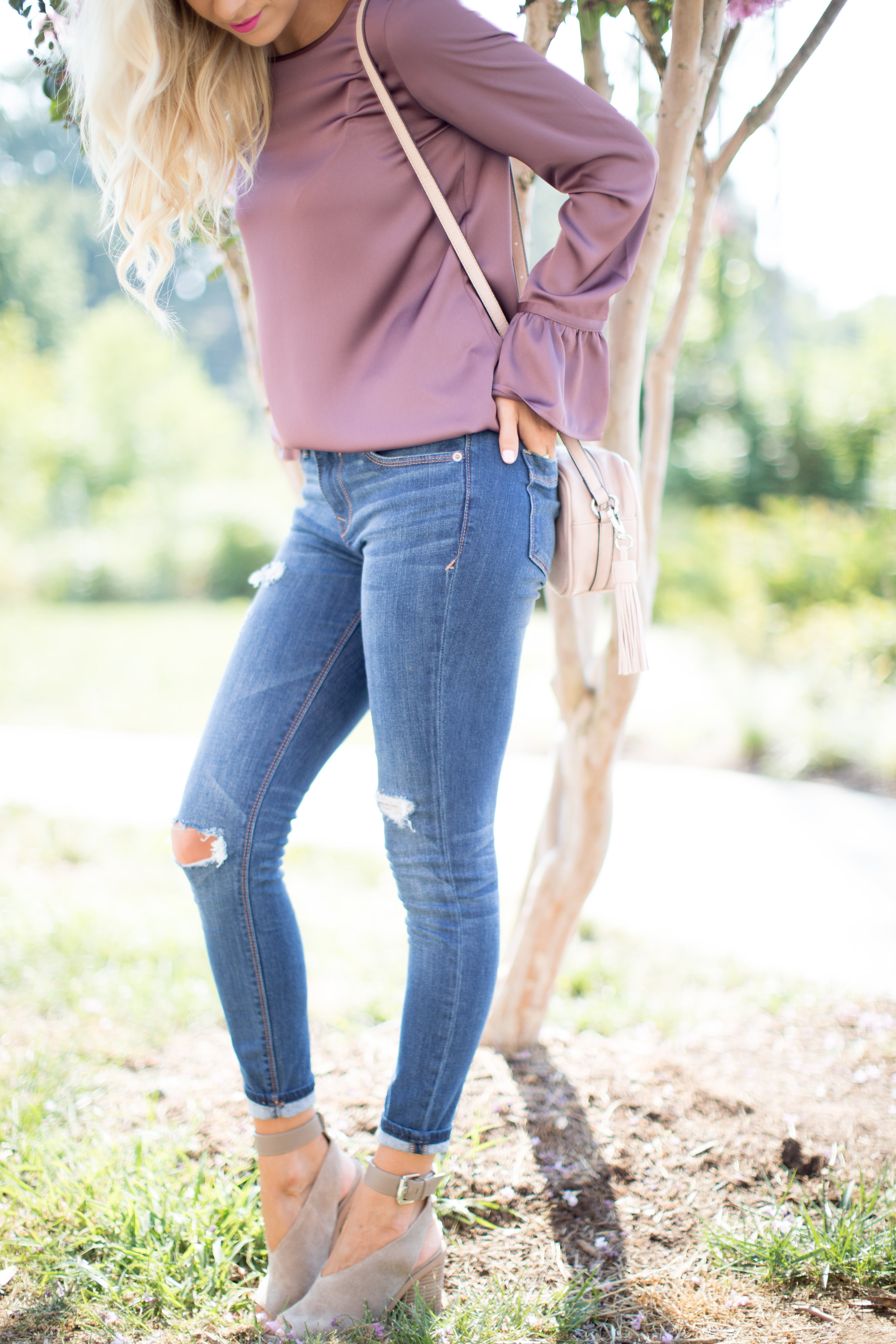 I’ve been needing some new Fall denim and Express had just what I needed! Express has so many good jeans right now with a good deal – buy one get the second pair for only $19.99 – that you can’t pass up! This distressed super skinny pair will be perfect for Fall weather! I am in love with this satin blouse and the flare sleeves! This top is great for a light layer and underneath layers for Fall! This thornberry shade caught my eye, but it comes in 3 others!