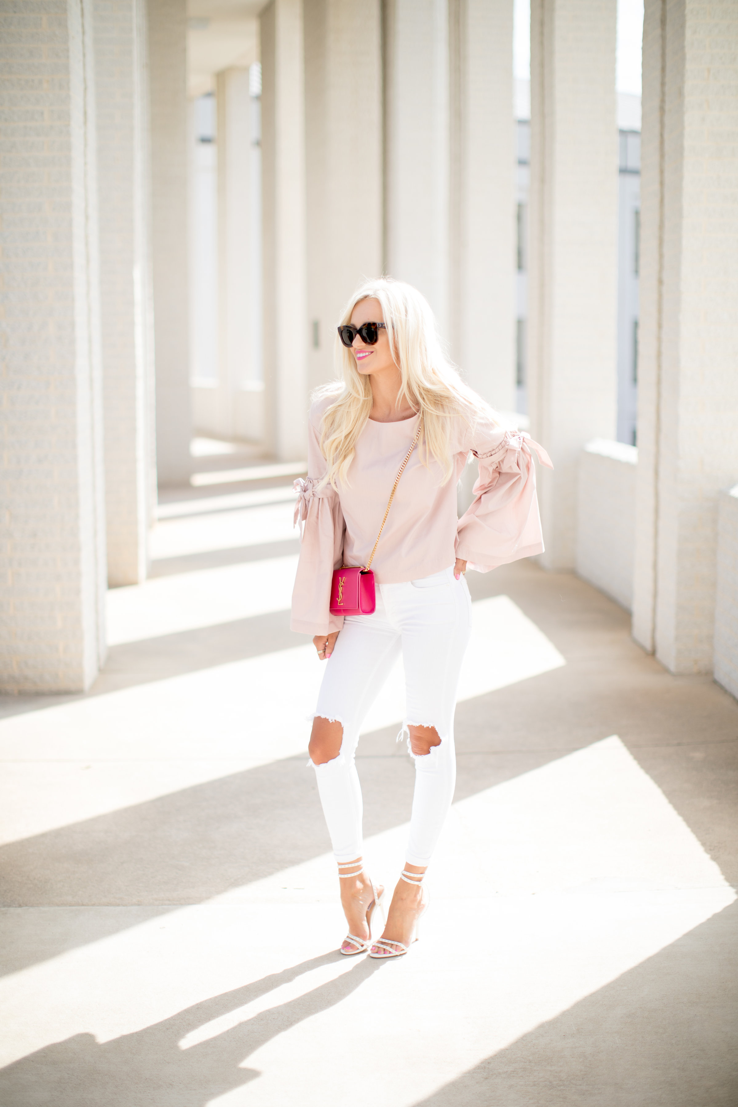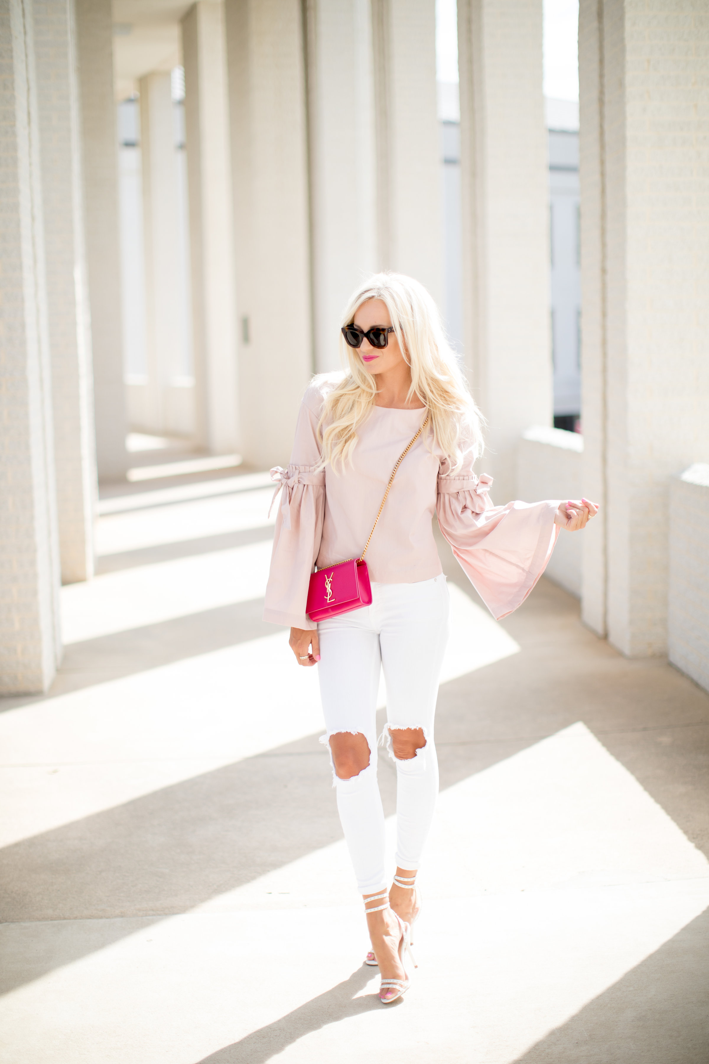 I think I found the most perfect bell sleeve top! This Free People top is too cute with the bow details! This pink is my favorite, but it also comes in black and white! I love this top with the white denim and heels also!