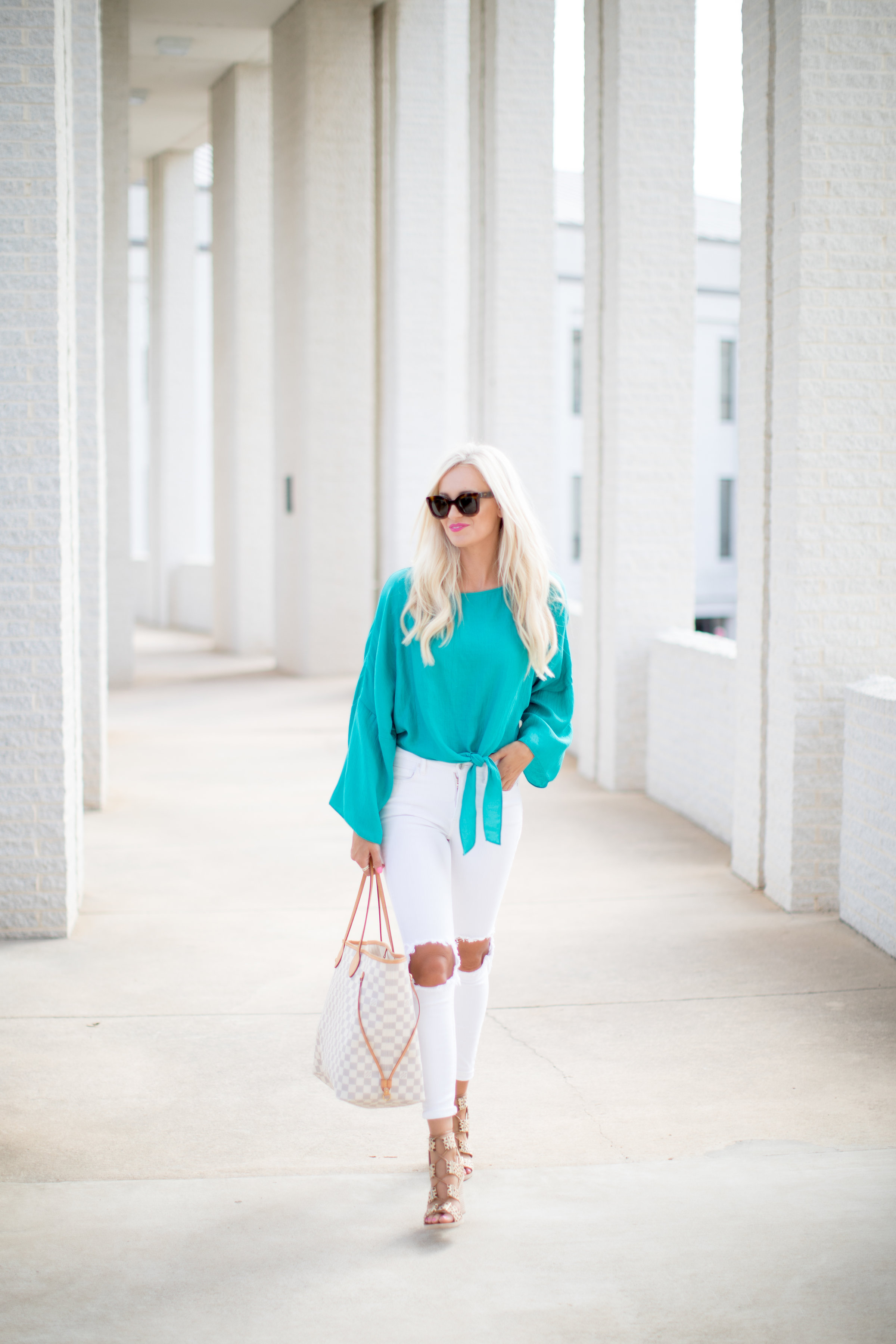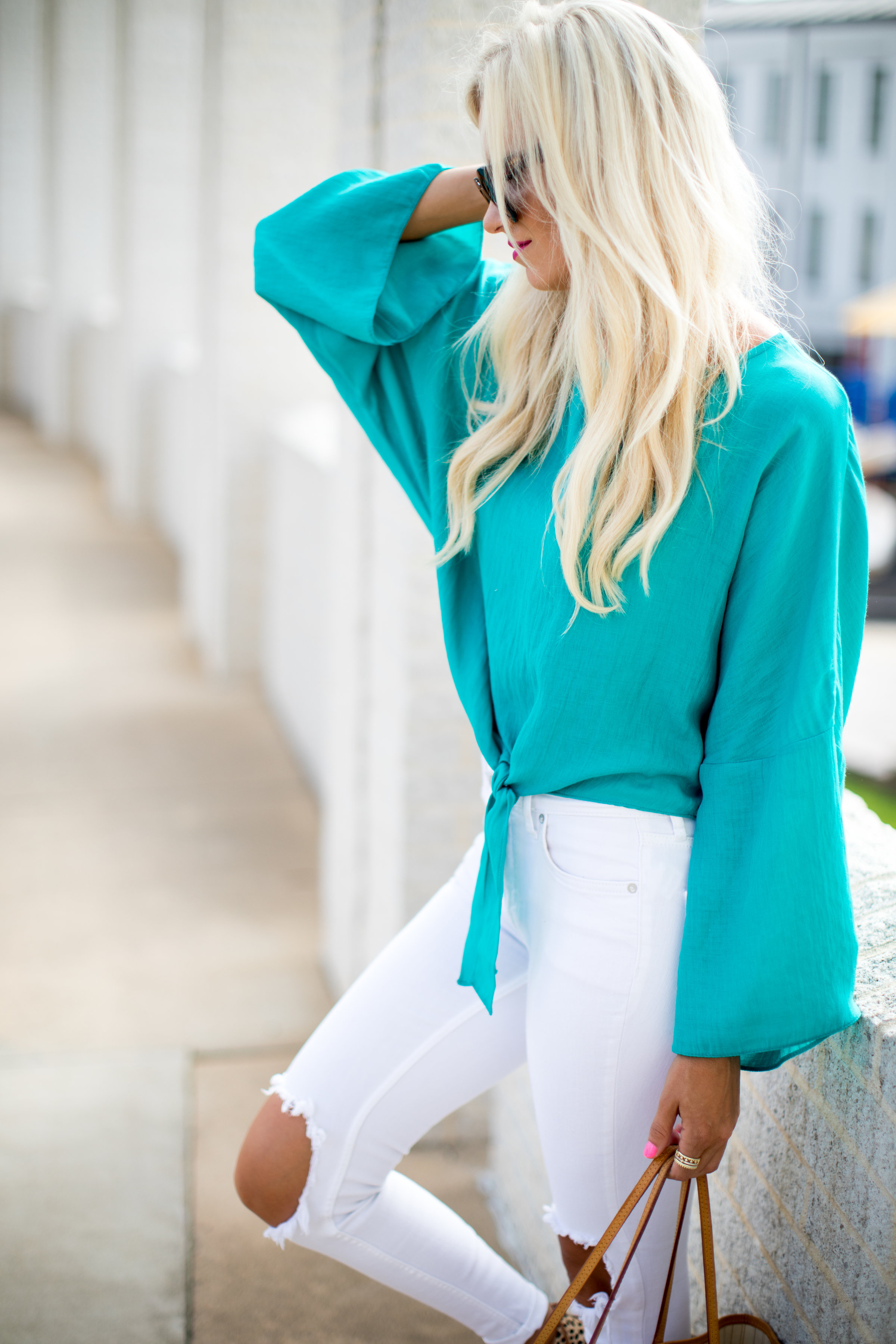 This turquoise top is all I need! There is nothing better to pair a bright top like this with than white Jeans! I love the loose fit of this top and the little tie in the front. This top only gets better because it comes in yellow and red! I love pairing a bright top with neutral shoes, like these leopard ones, which add a little something else to this look!