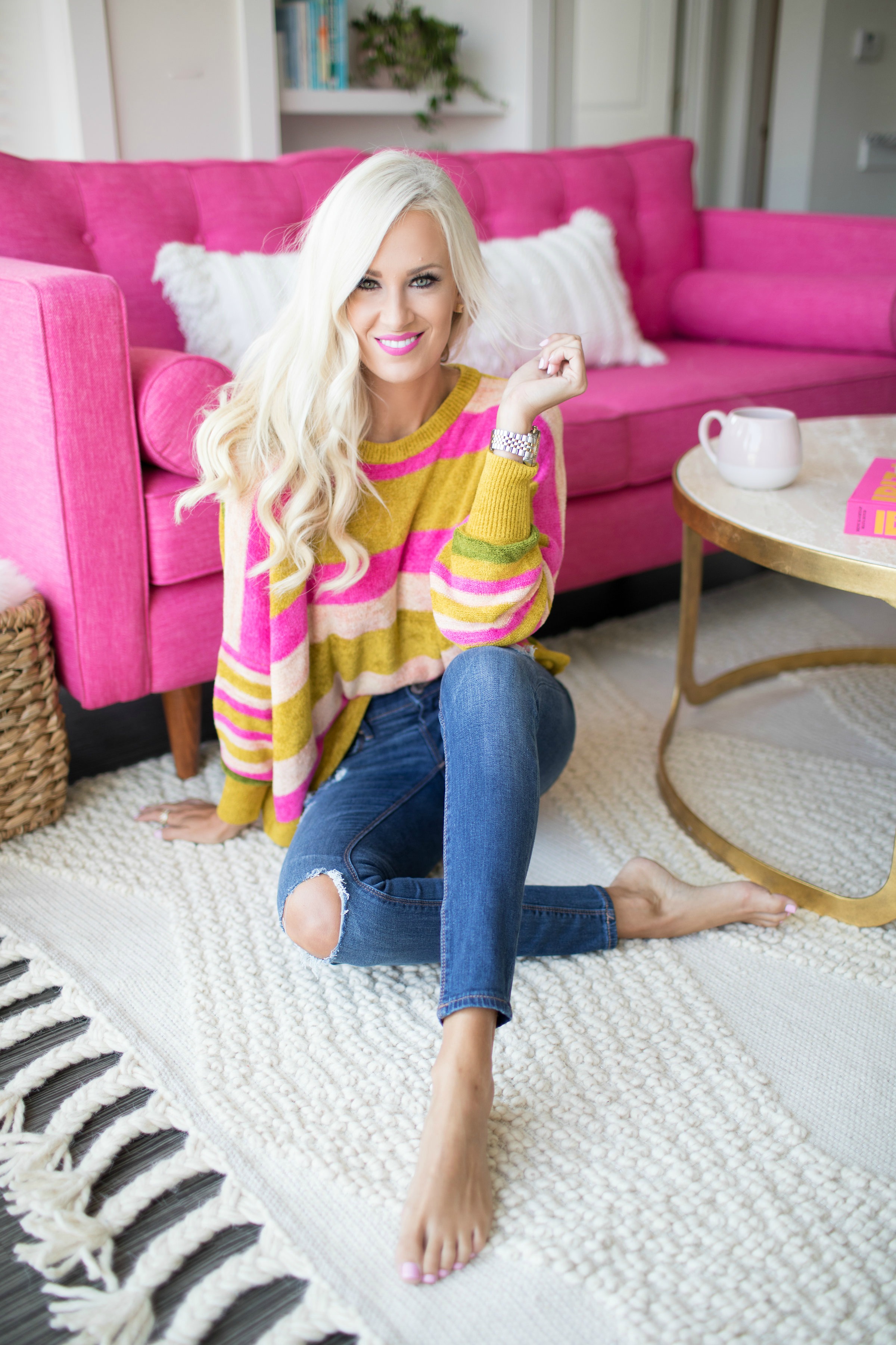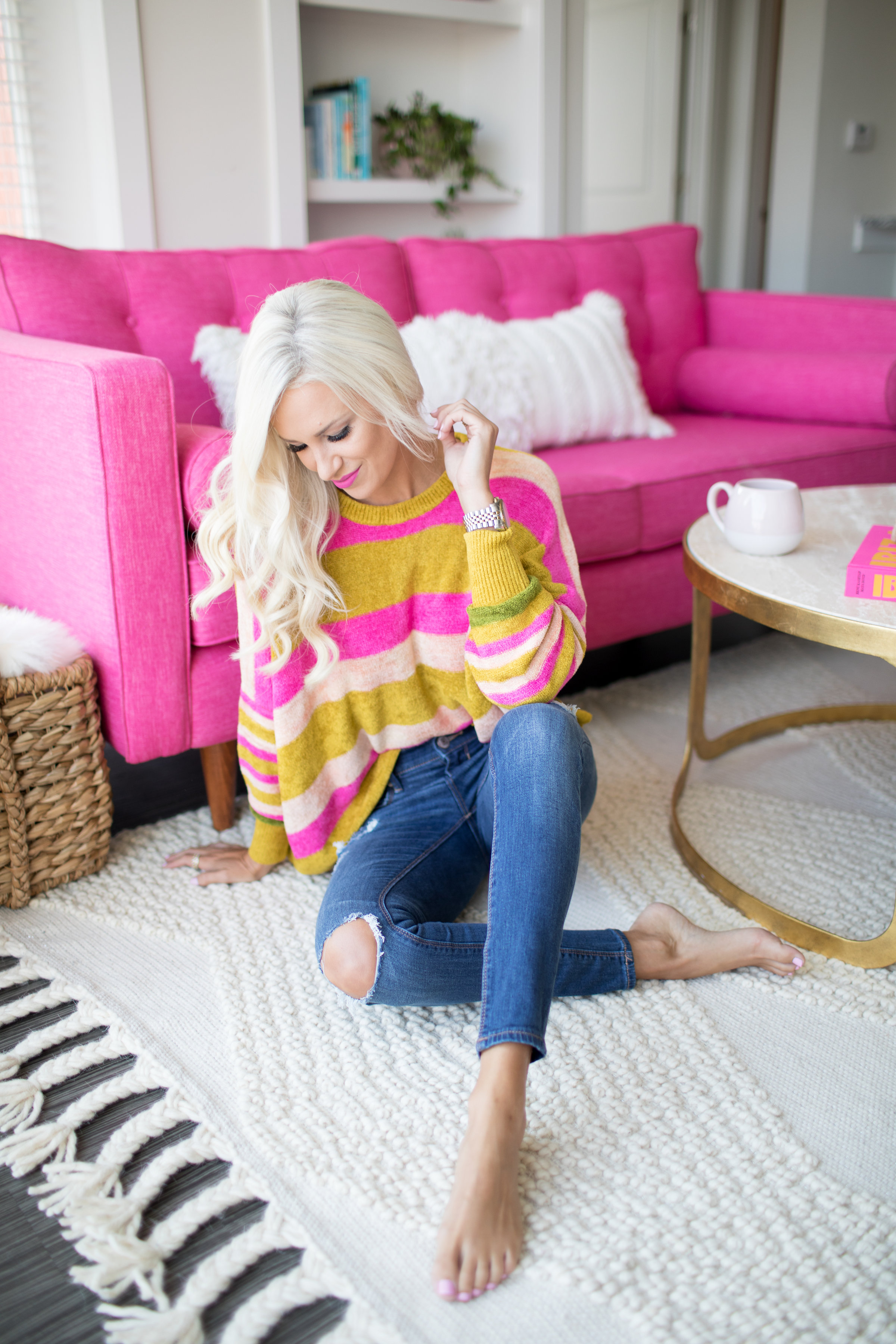 Your pink couch is everything! I love that your sweater matches too 🙂 The rug really ties the whole room together; great choice!
