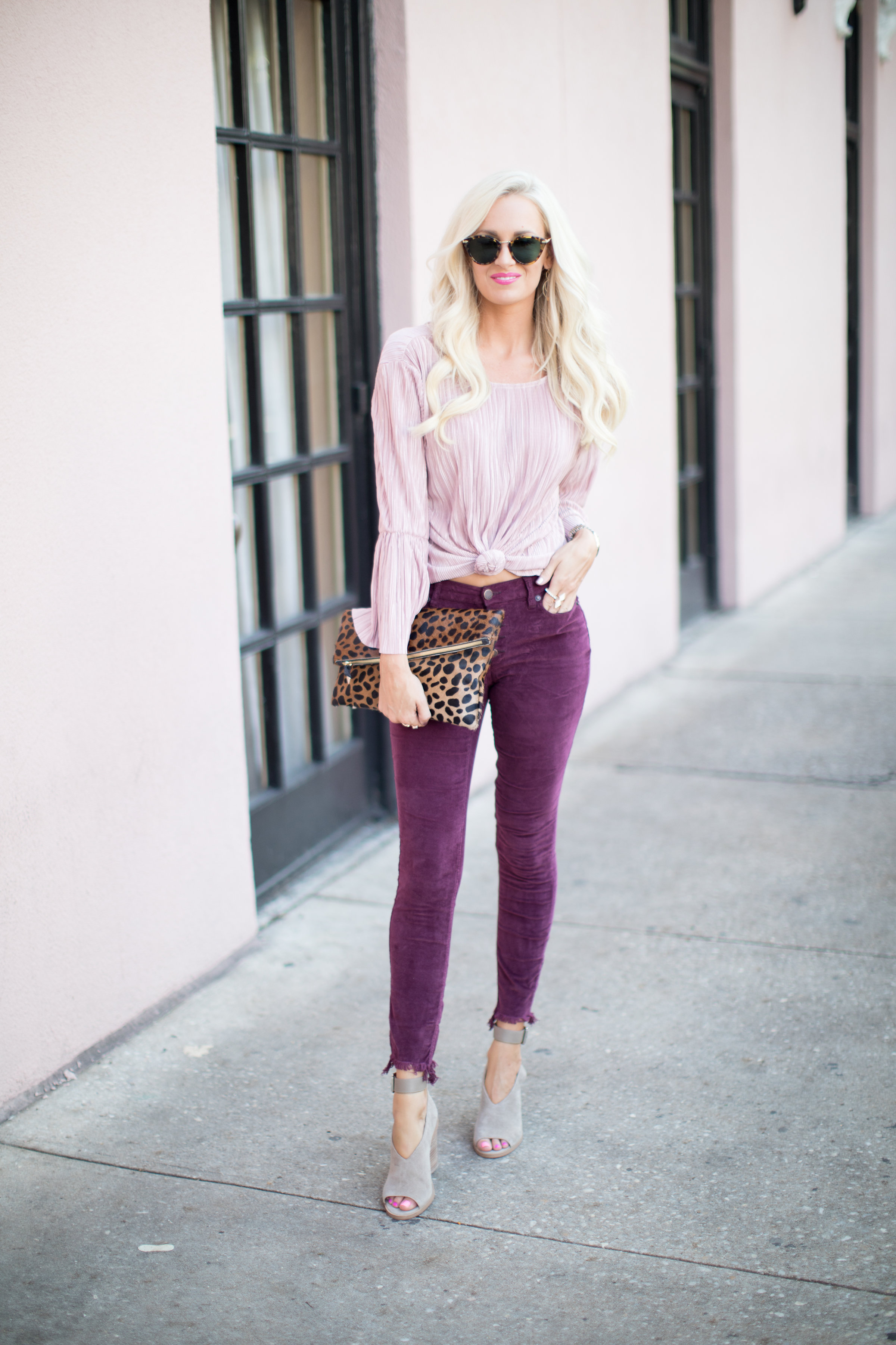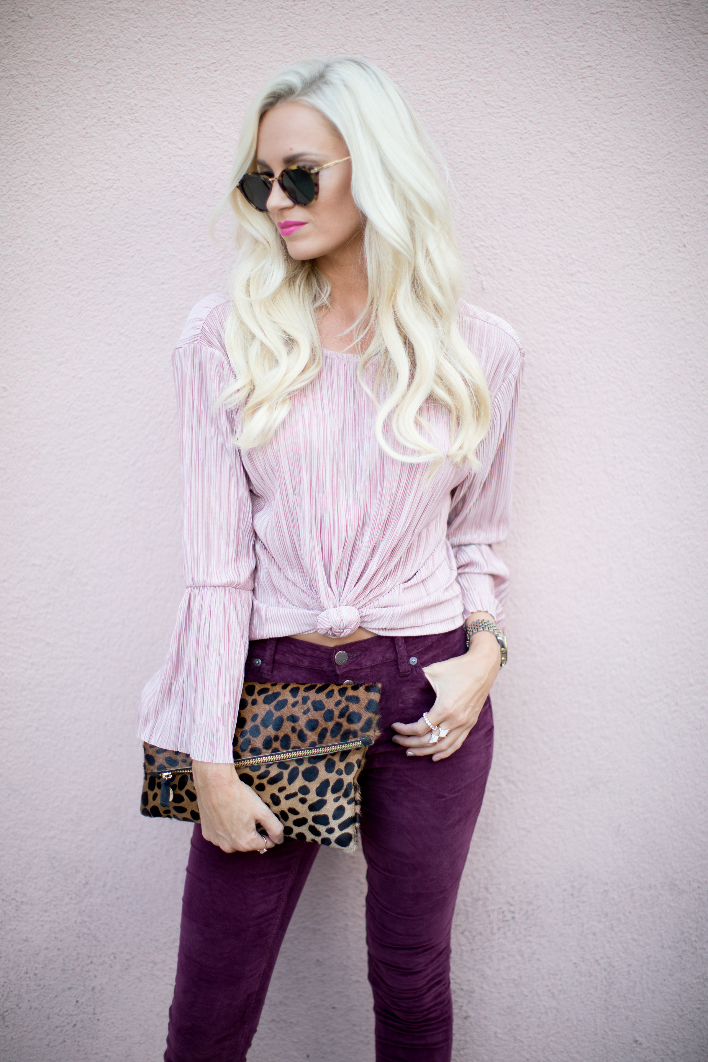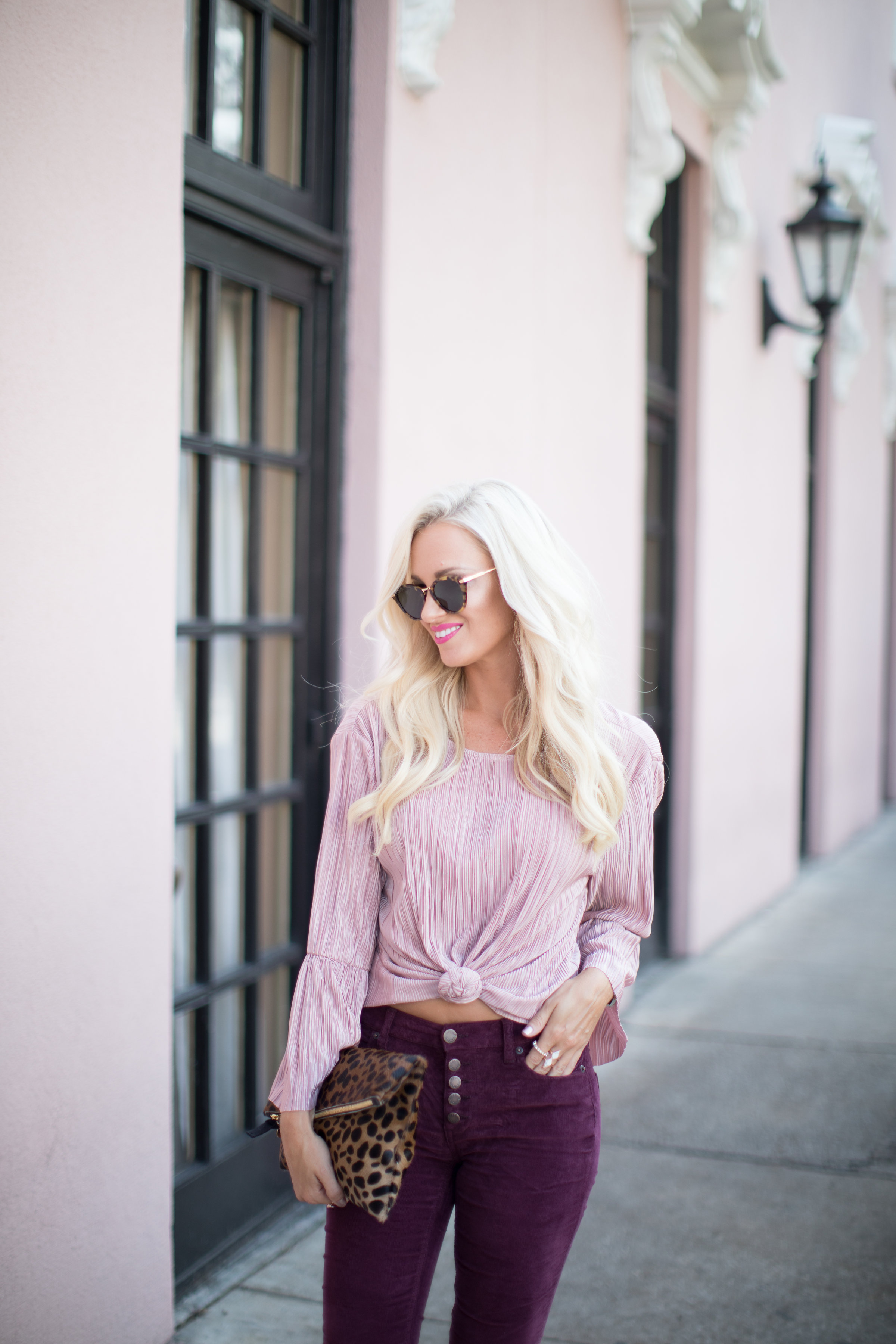 Blush Top- Nordstrom | Cords- Free People | Sunglasses- Sonix | Heels- Marc Fisher | Clutch- Clare V | Earrings- Nordstrom | Lipstick – MAC Pickled Plum