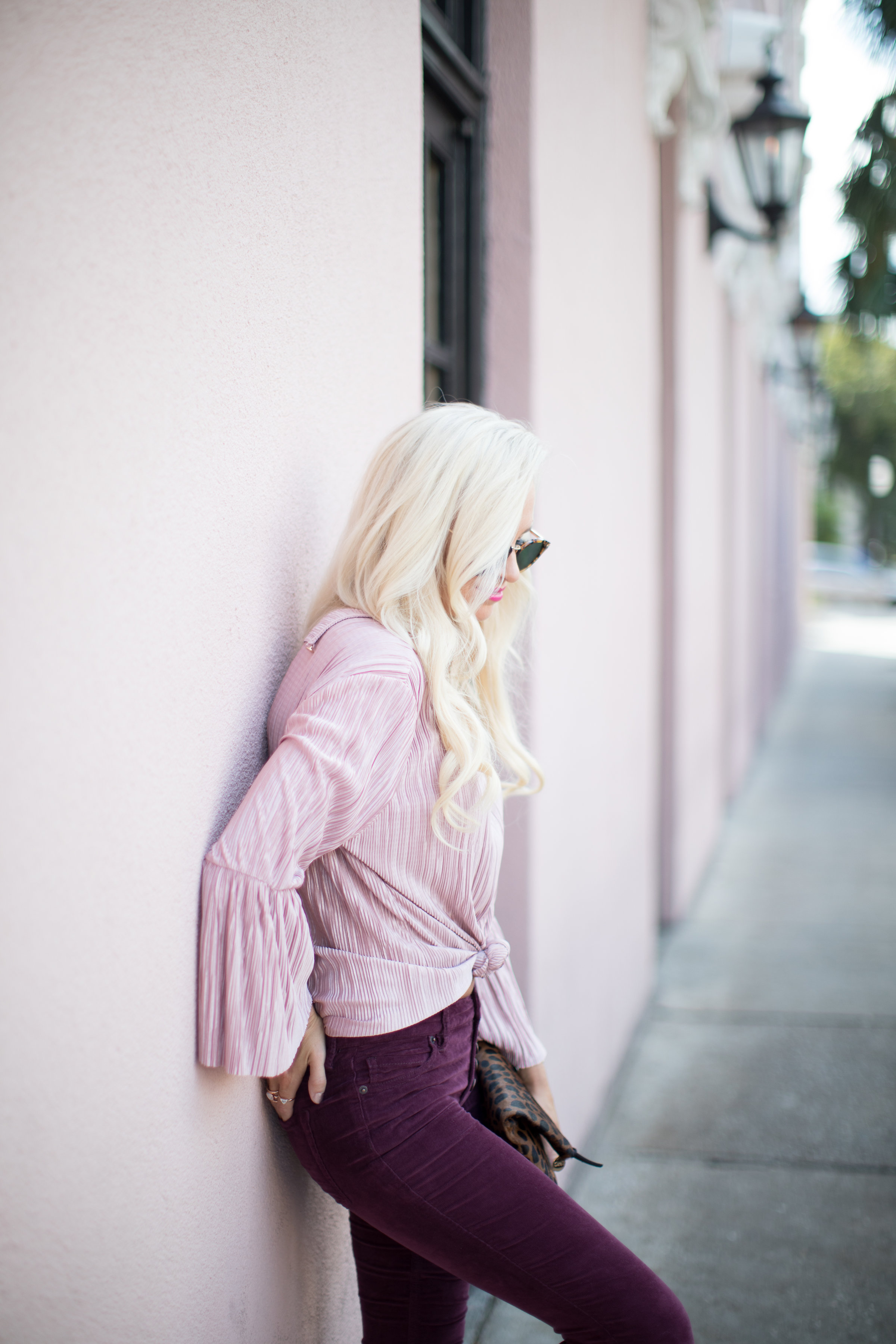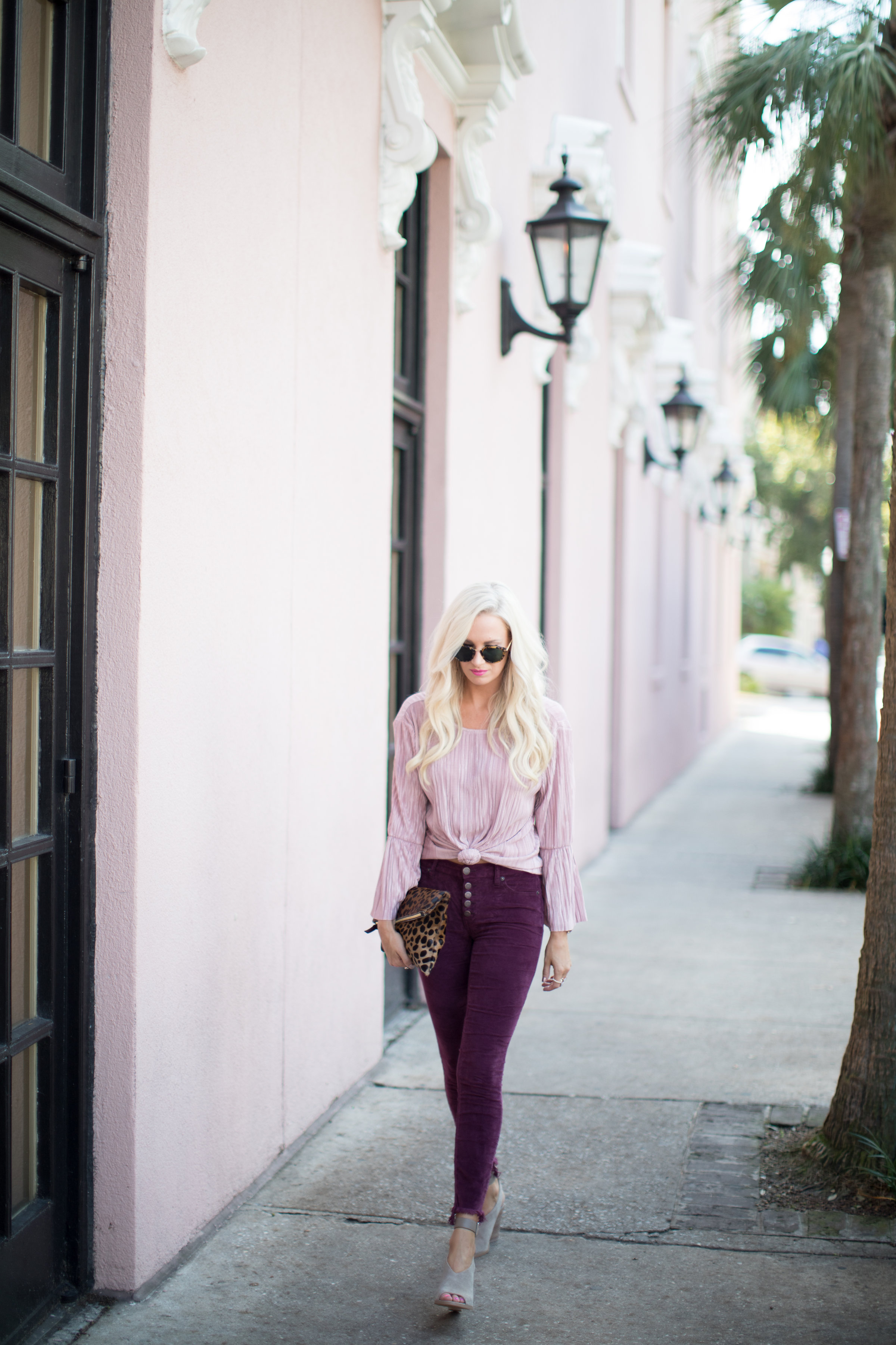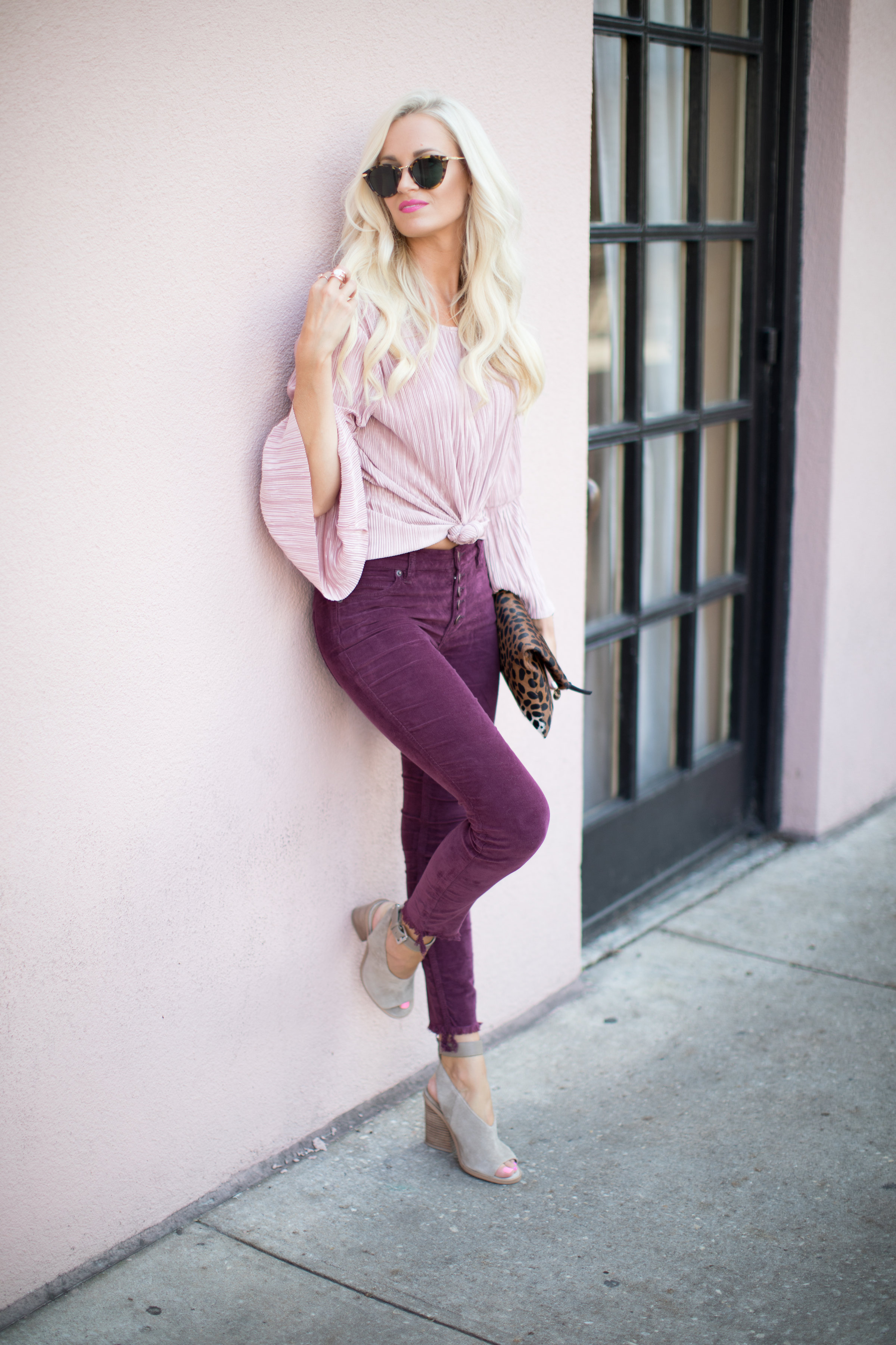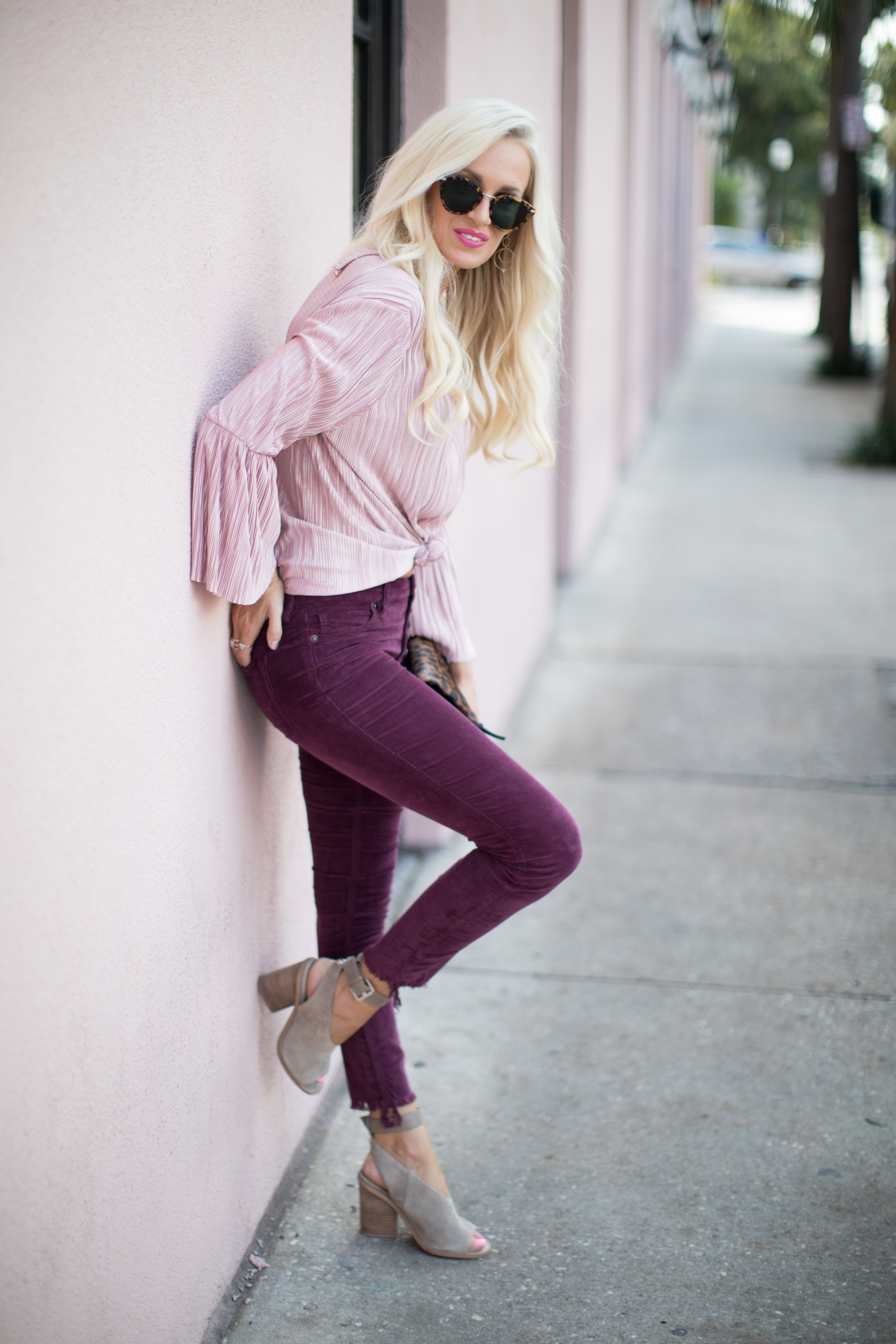 Blush Top- Nordstrom | Cords- Free People | Sunglasses- Sonix | Heels- Marc Fisher | Clutch- Clare V | Earrings- Nordstrom | Lipstick – MAC Pickled Plum