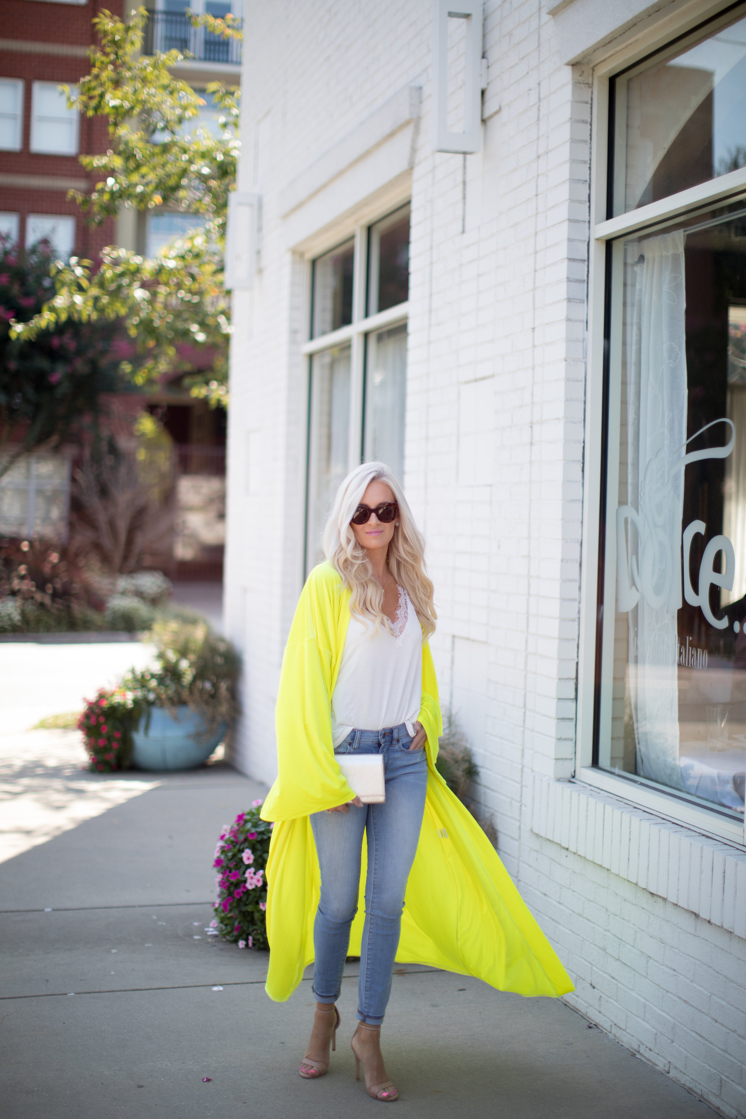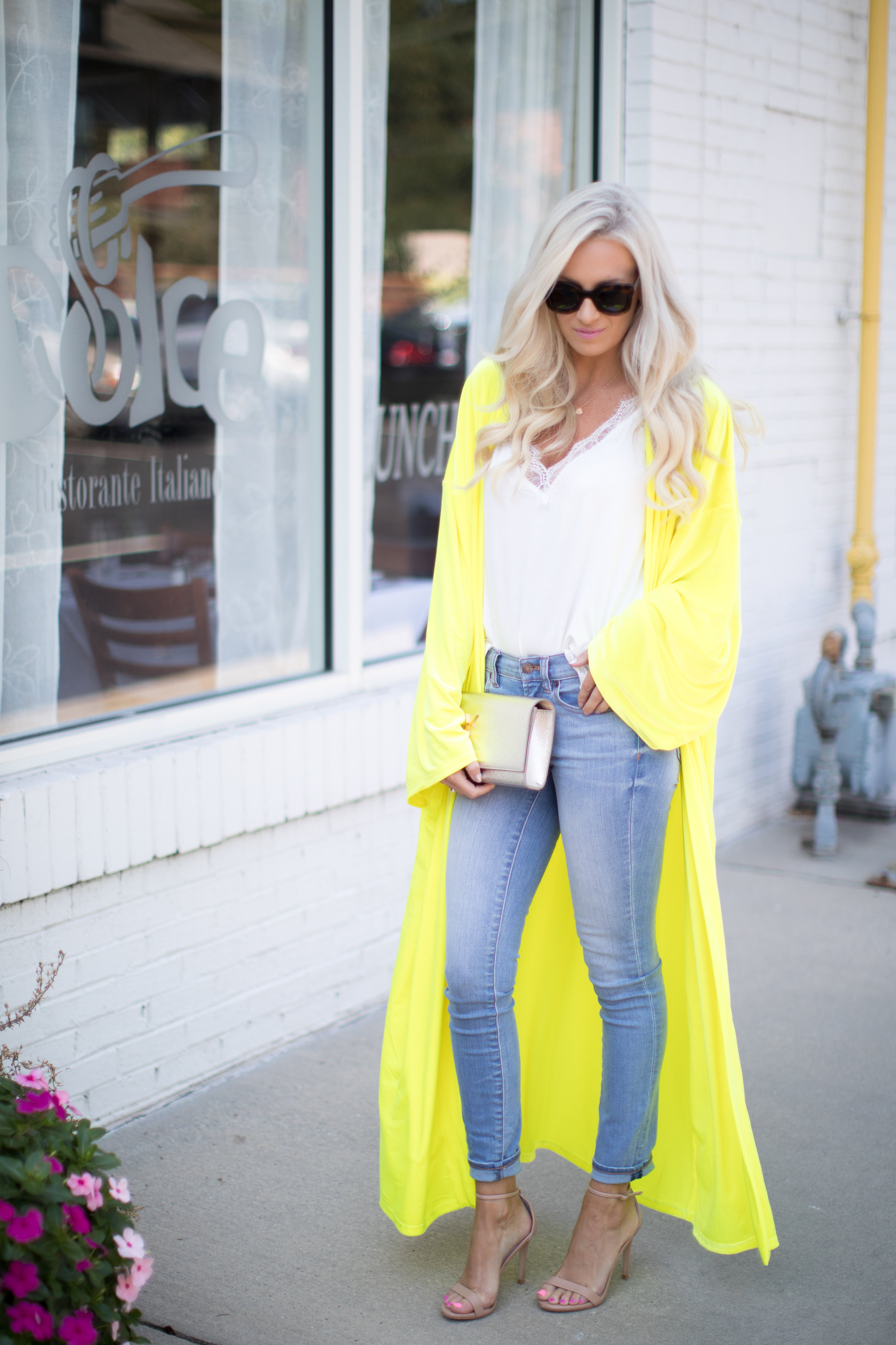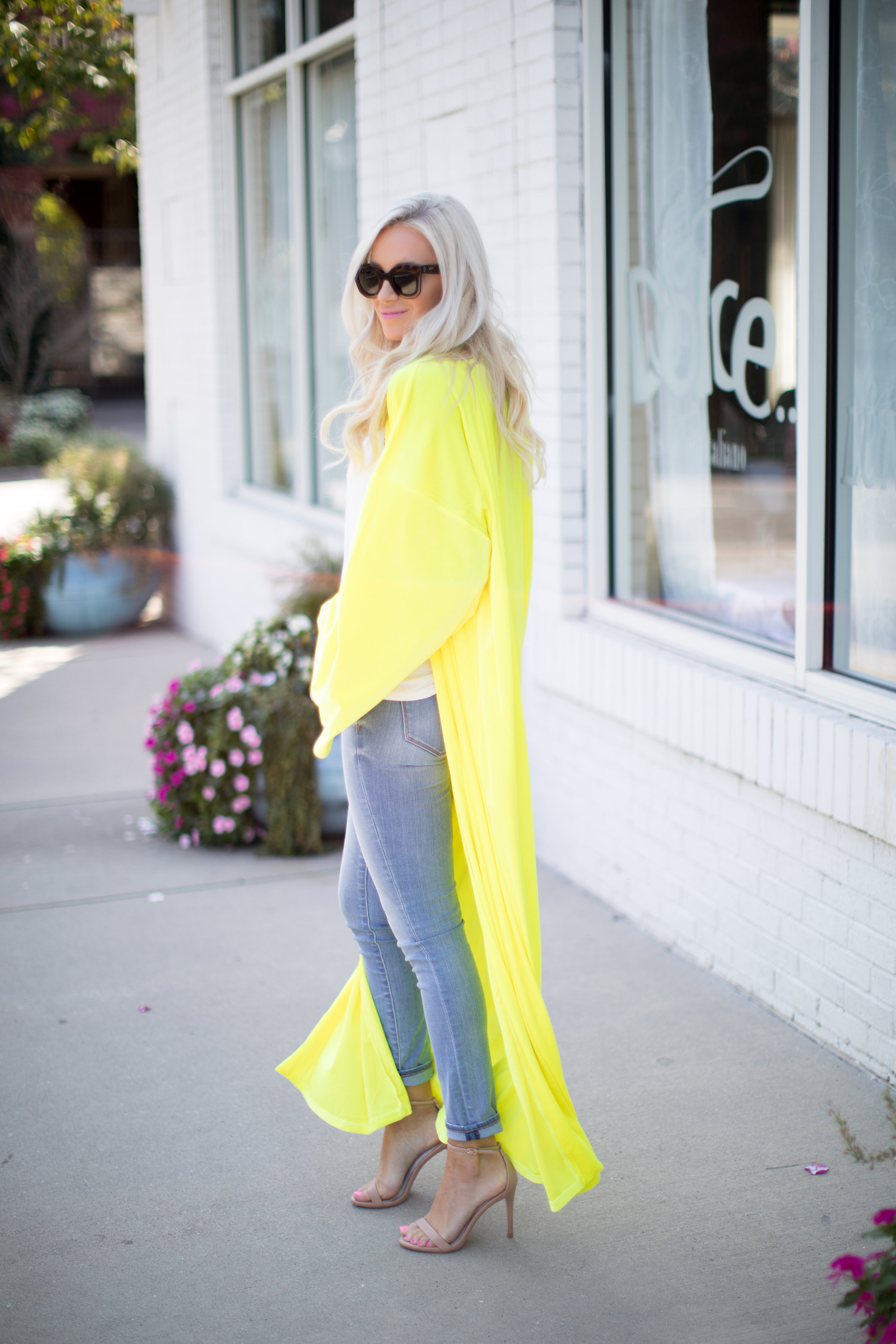 I personally stay away from neon colours, but I think you look great in the yellow kimono. Bonus points for the velvet material too!