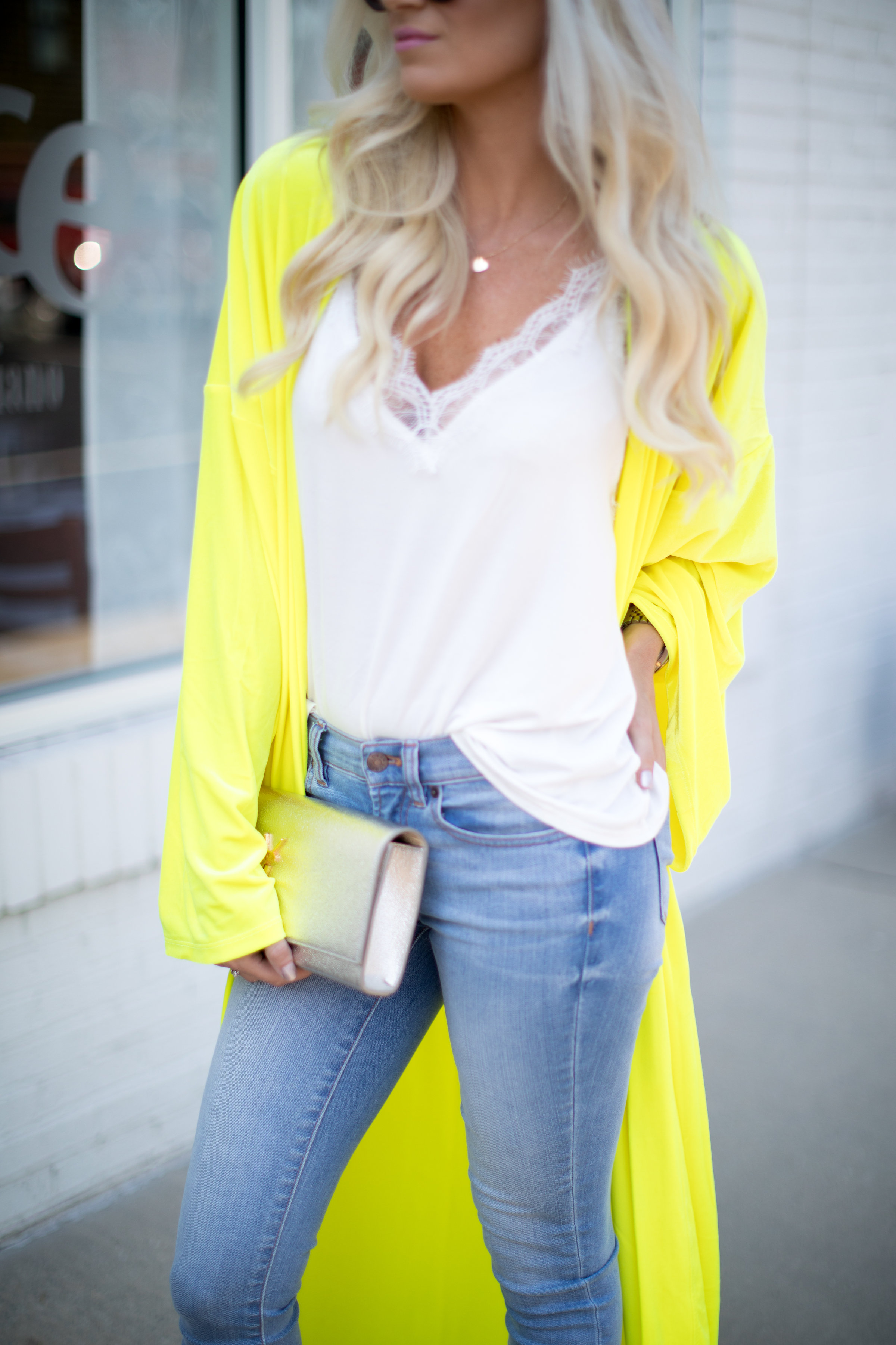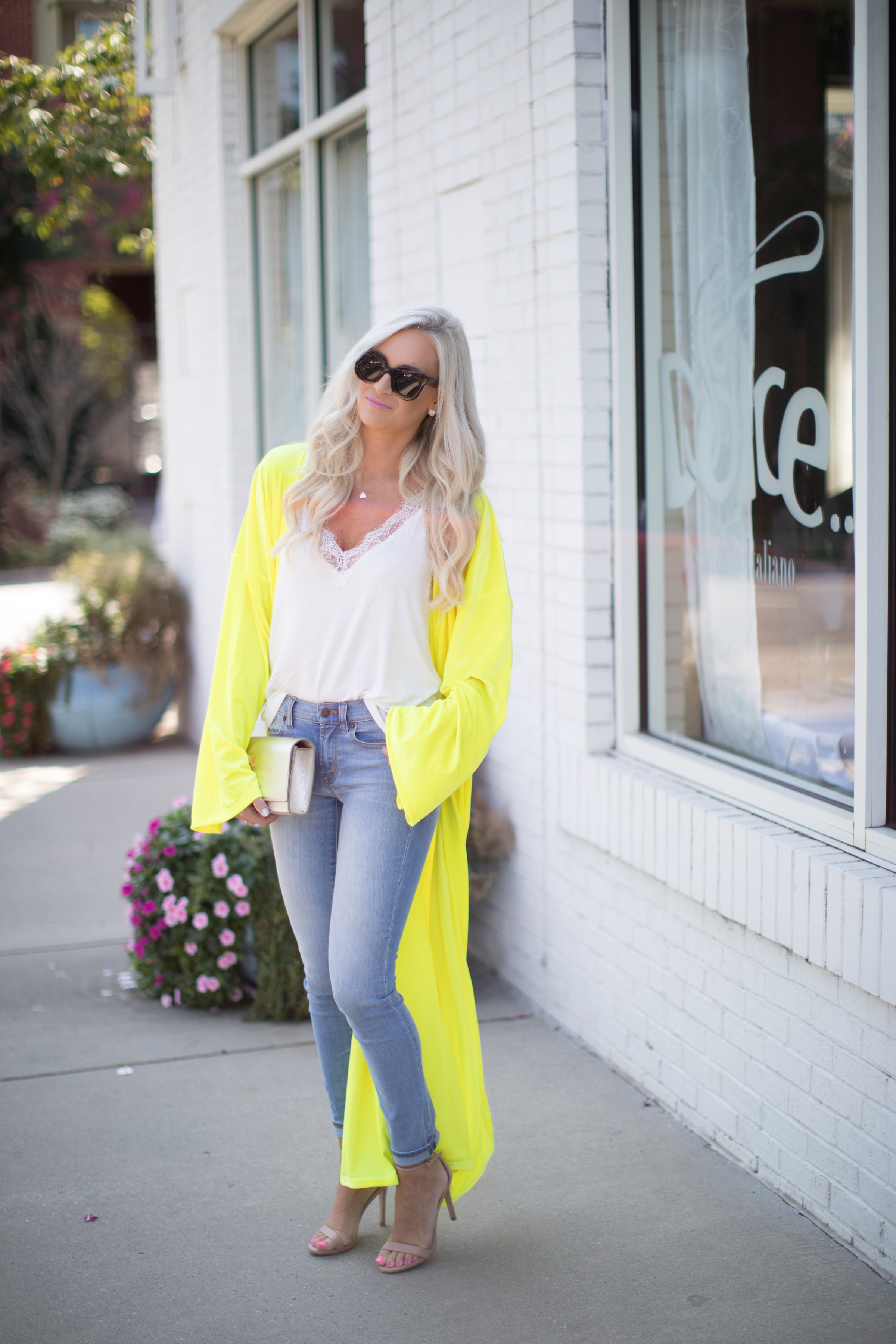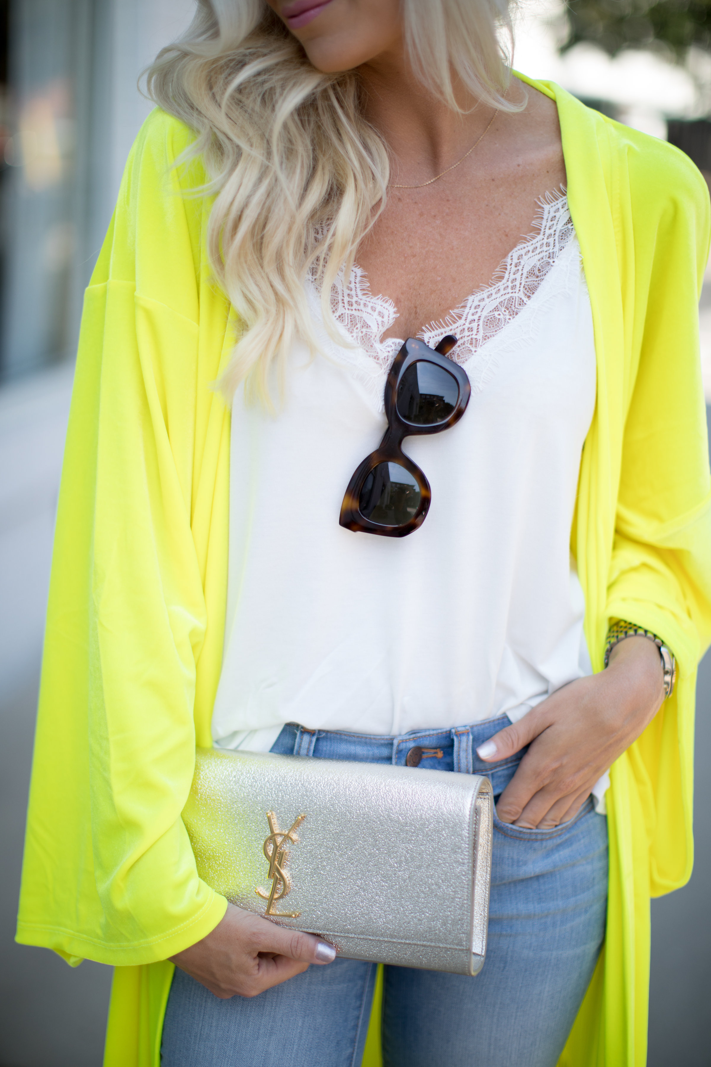 ASOS Yellow Duster | Shop Boutinelli Cami | J.Crew Factory Denim | Steve Madden Heels | YSL Clutch | Celine Sunglasses | Heart Necklace | Michael Kors Watch | MAC Pickled Plum Lipstick
