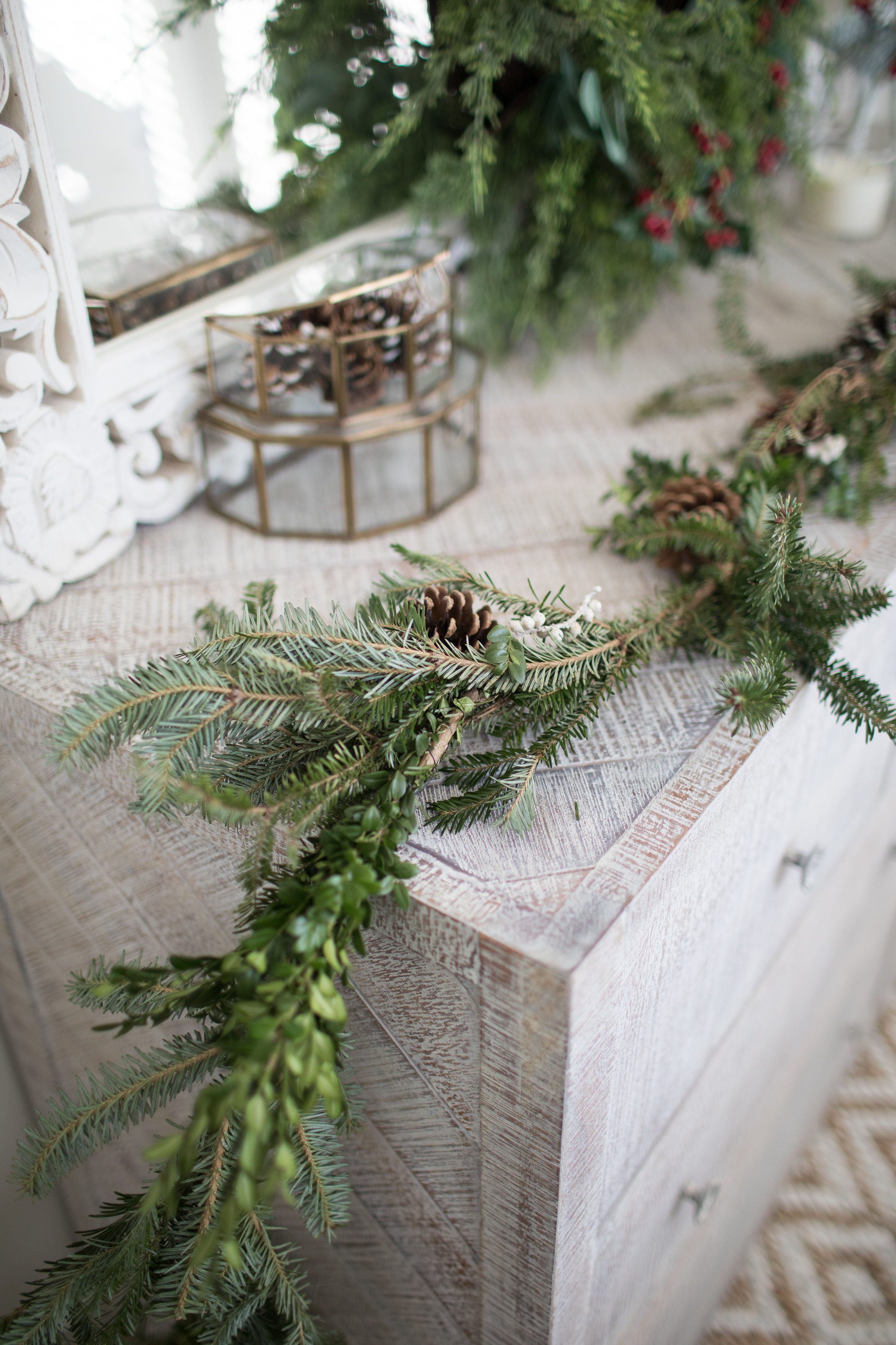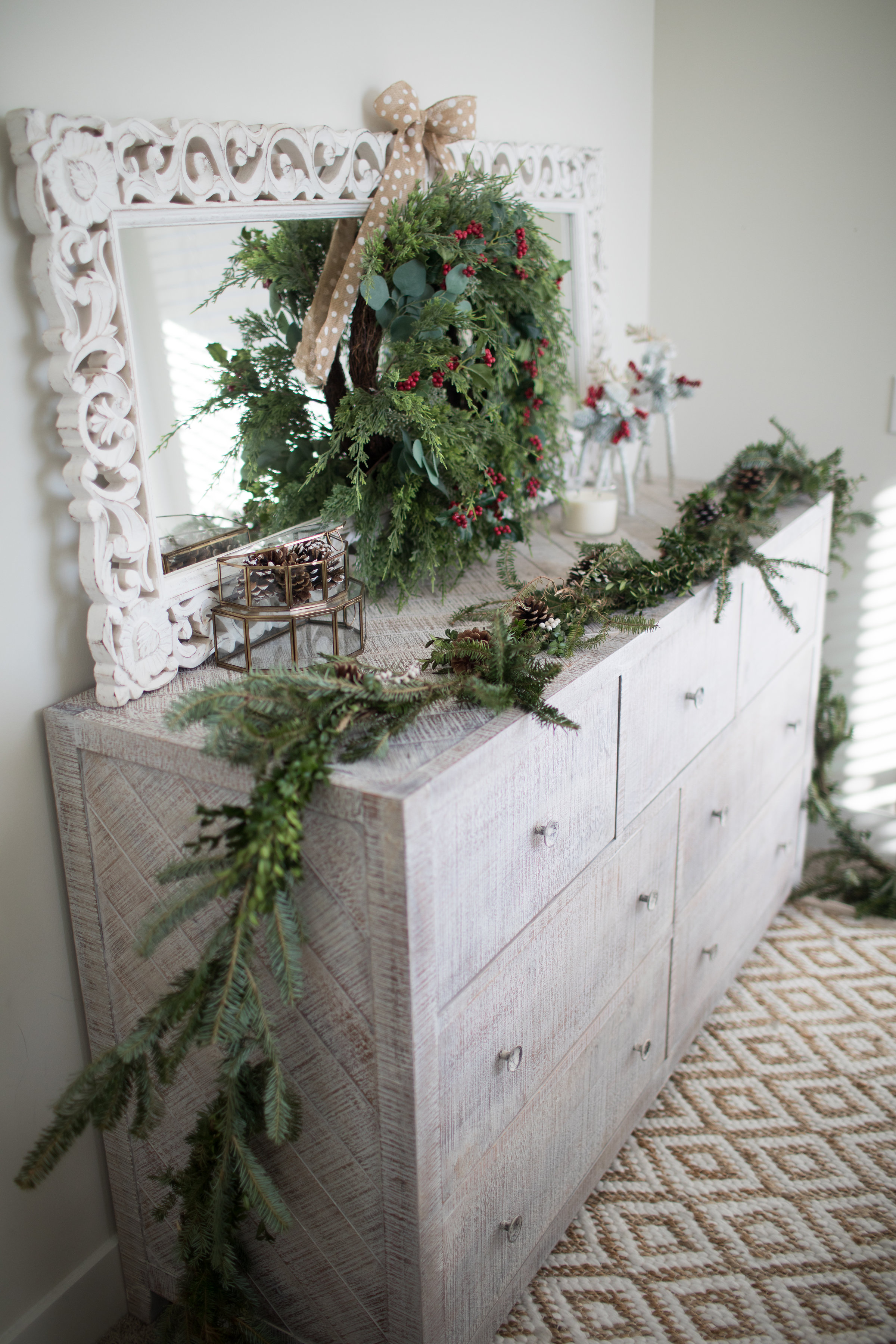 Adding a little holiday decor to my new favorite corner in my room. When I saw this dresser from Joss & Main I knew it was a must! I love the natural finish and grey tone of this wood, pairs perfectly with my boho space. Adding fresh garland is an easy way to source up any space for the holidays, not to mention it smells heavenly!