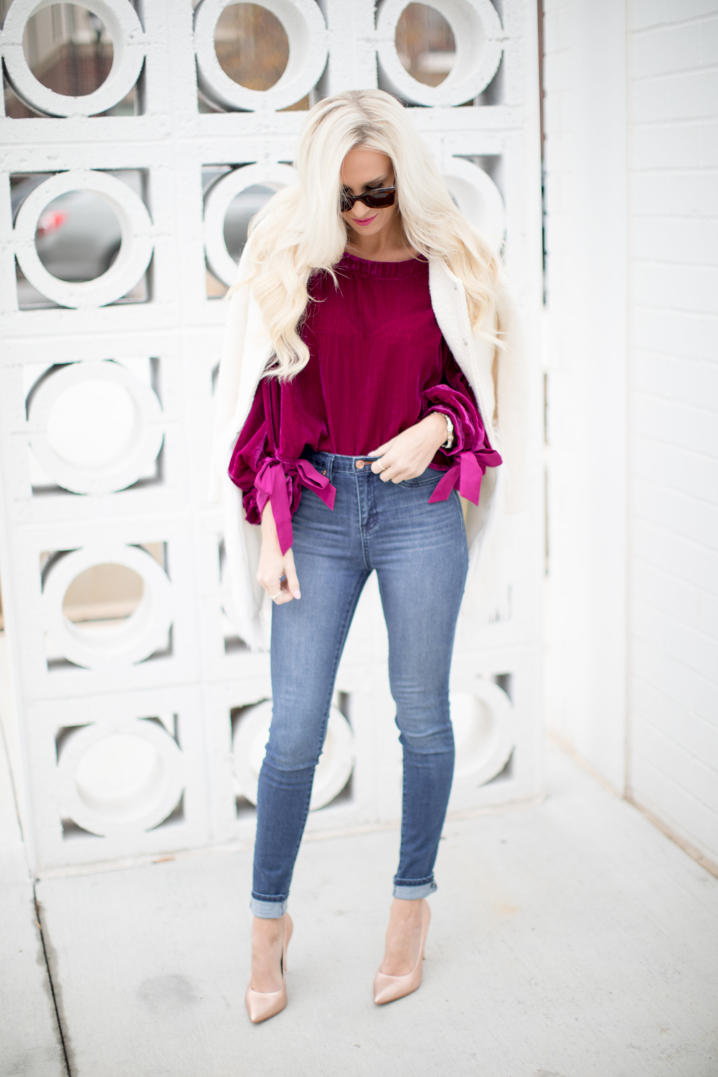 Pink Velvet Top also come in navy | White Faux Fur Jacket | High Waisted Denim | Rose Gold Pumps | Celine Sunglasses | Michael Kors Watch | Kendra Scott Rings | MAC Girl About Town Lipstick