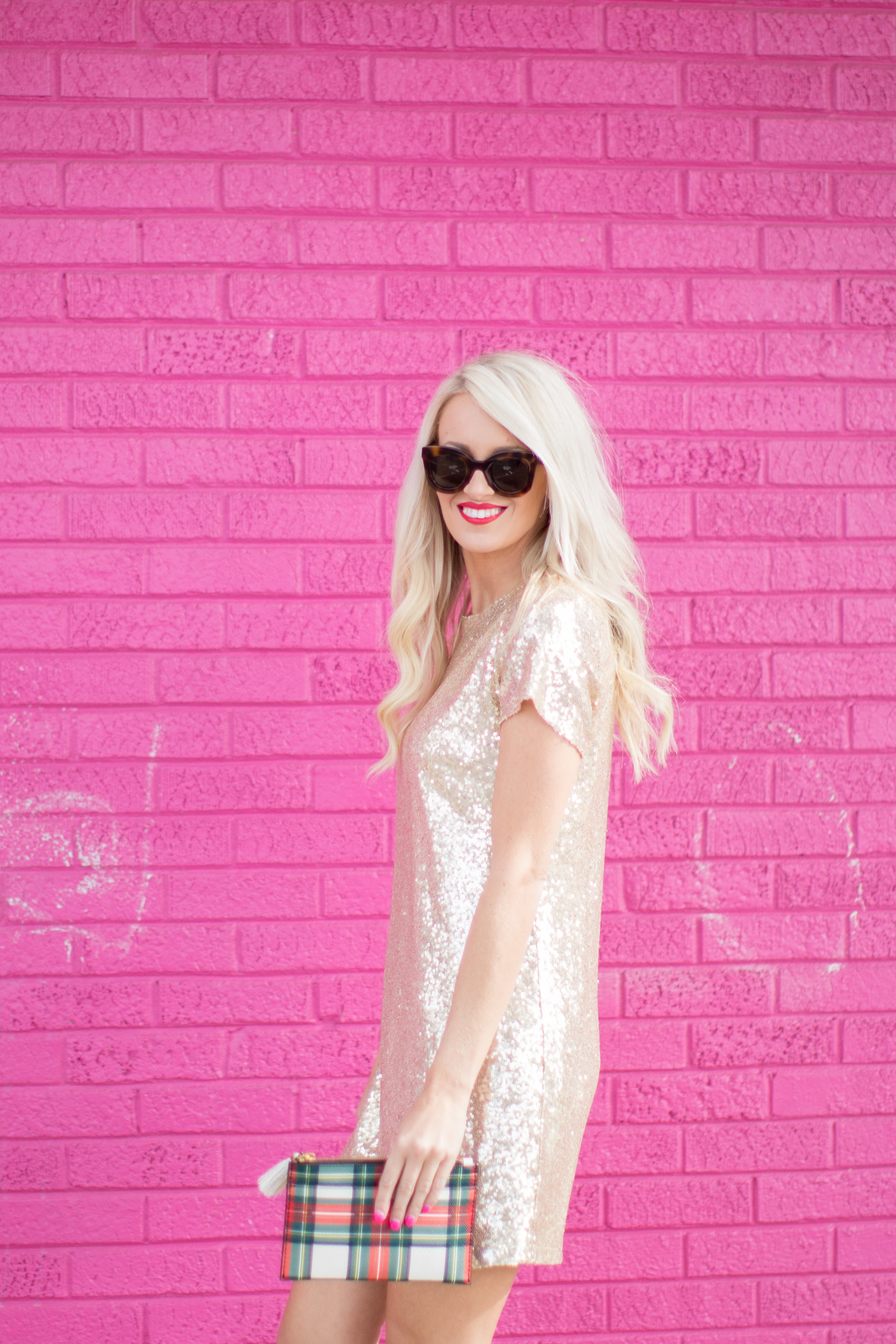 Sequin Dress, also loving this | Faux Fur, love this blush option | Plaid Clutch | Black Heels | Sunglasses | Red Lipstick