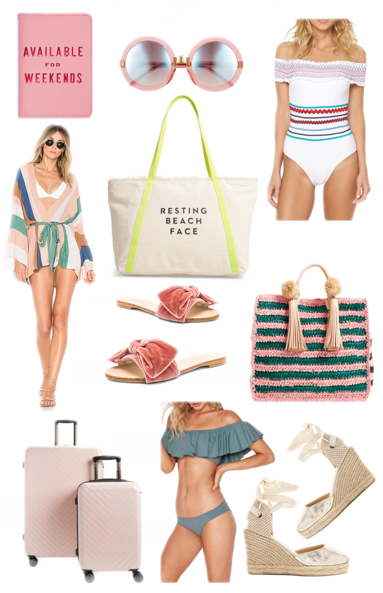 Passport Holder | Pink Sunglasses | White One Piece | Stripe Cover up | Beach Tote | Bow Sandals | Straw Beach Bag | Luggage | Off the Shoulder Swimsuit | Gold Wedges