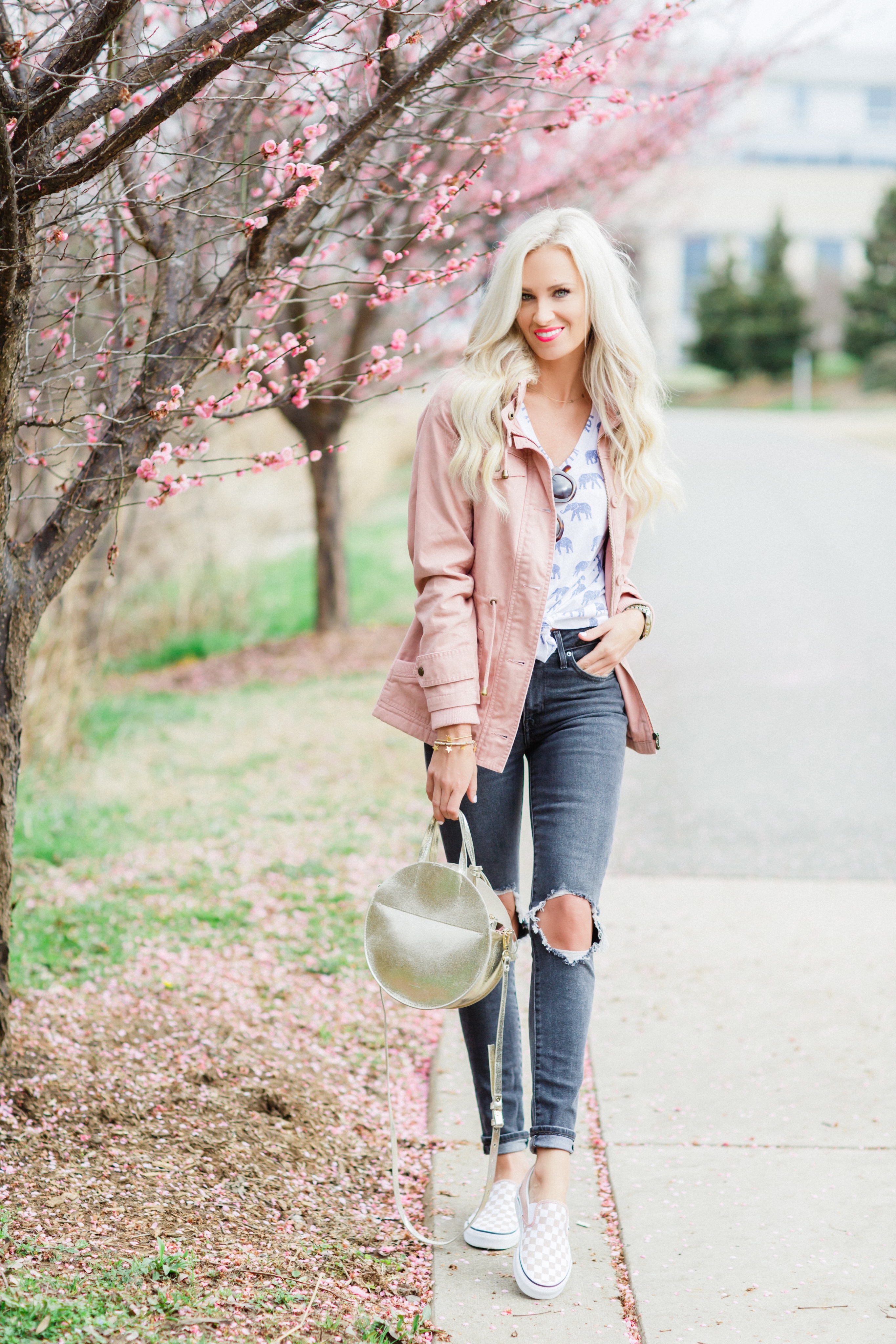 Light parka jackets overtop a blouse is the perfect edition to any outfit, especially if the weather is being moody! I love everything pink…and this blush tone parka is no exception. Having a parka with a hood is key if it starts to rain down in the middle of the day too!