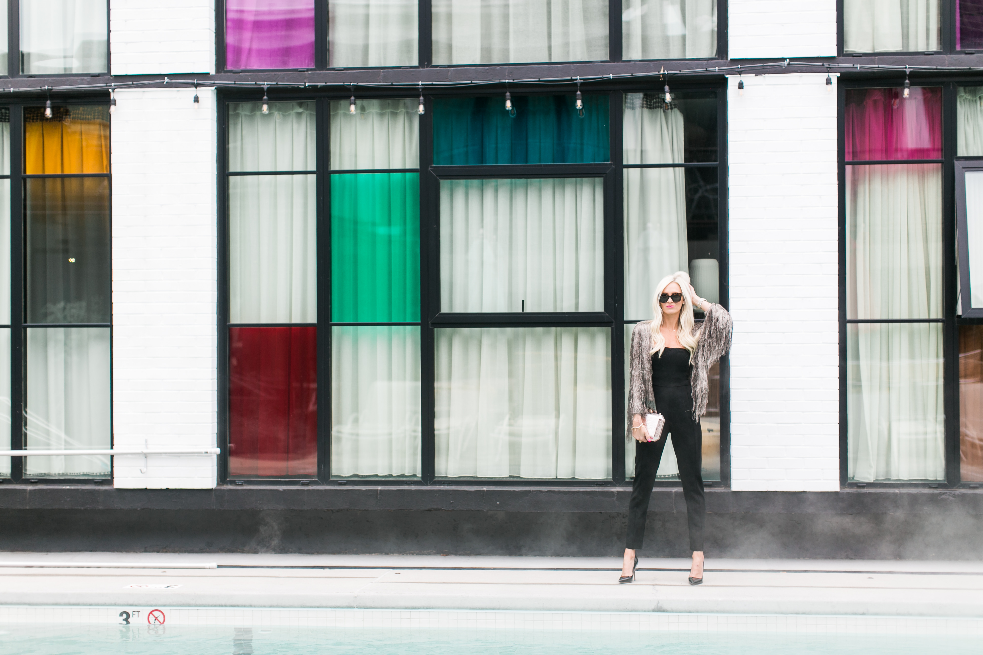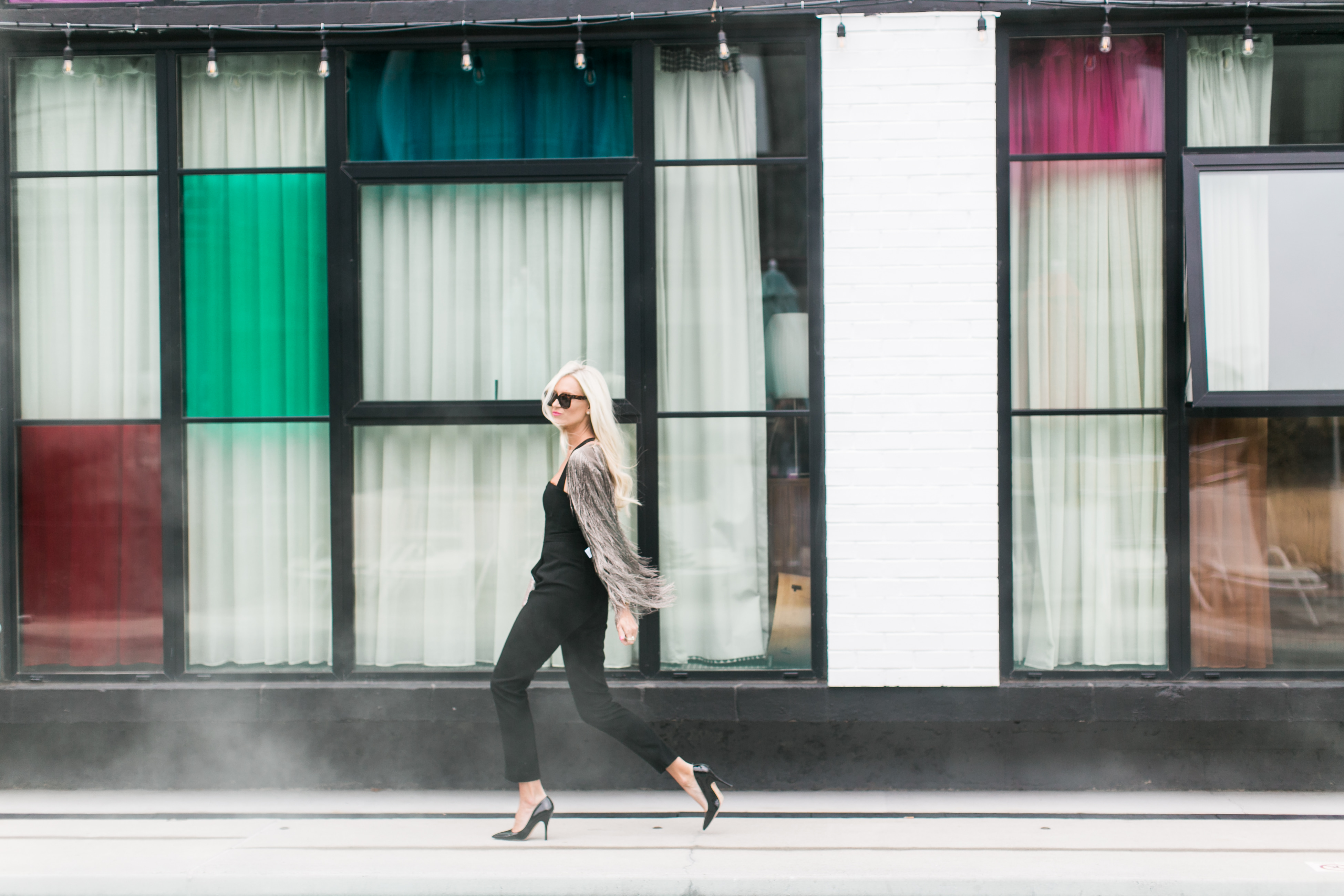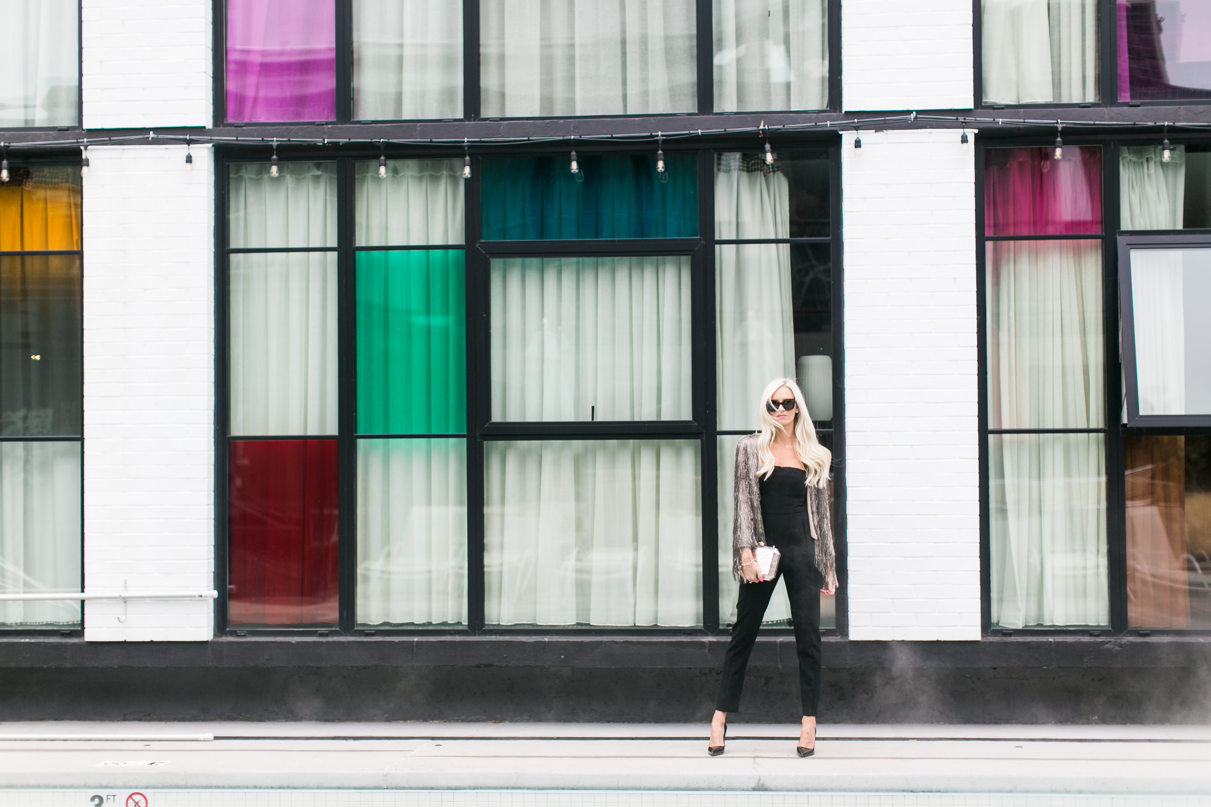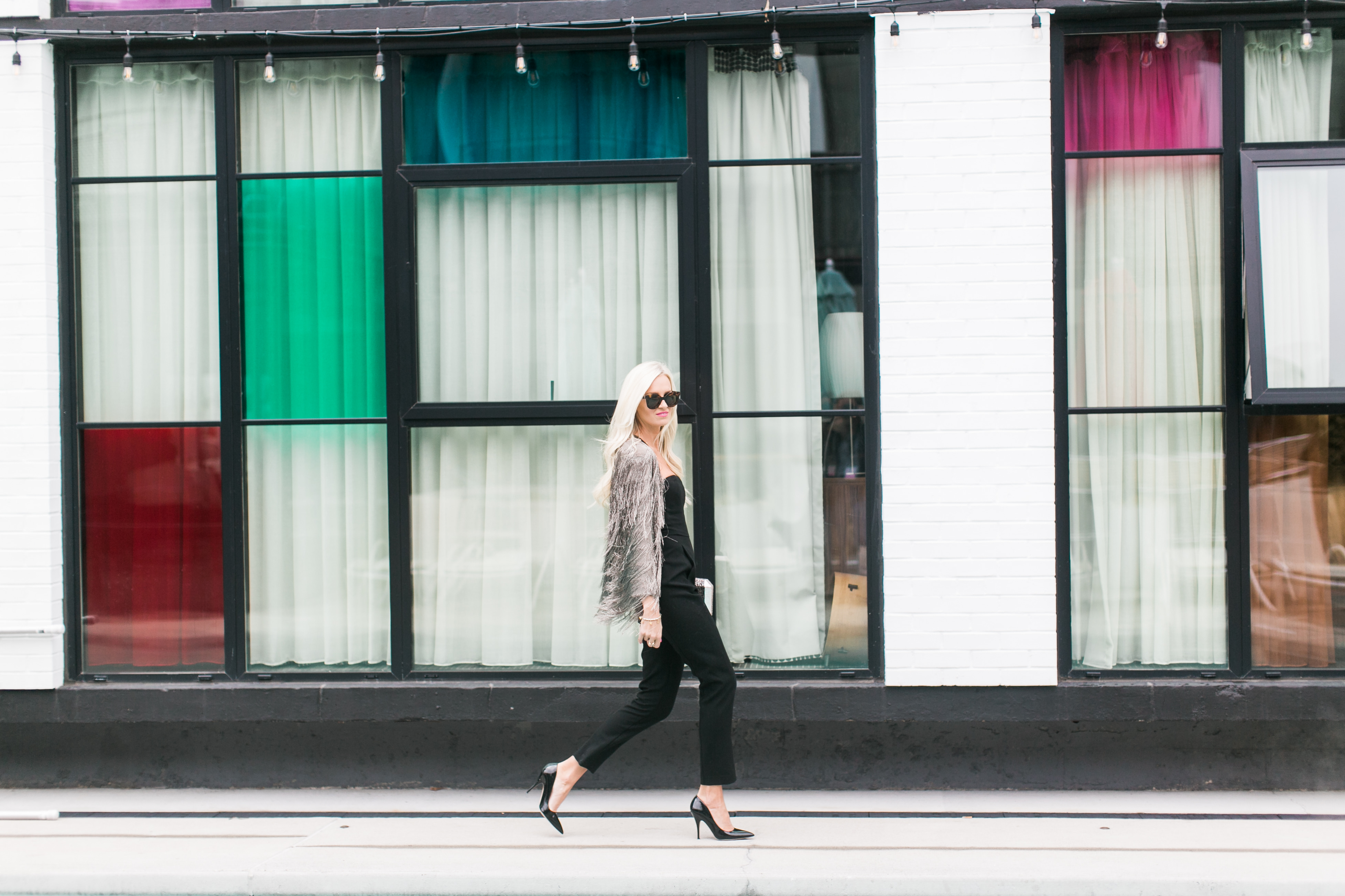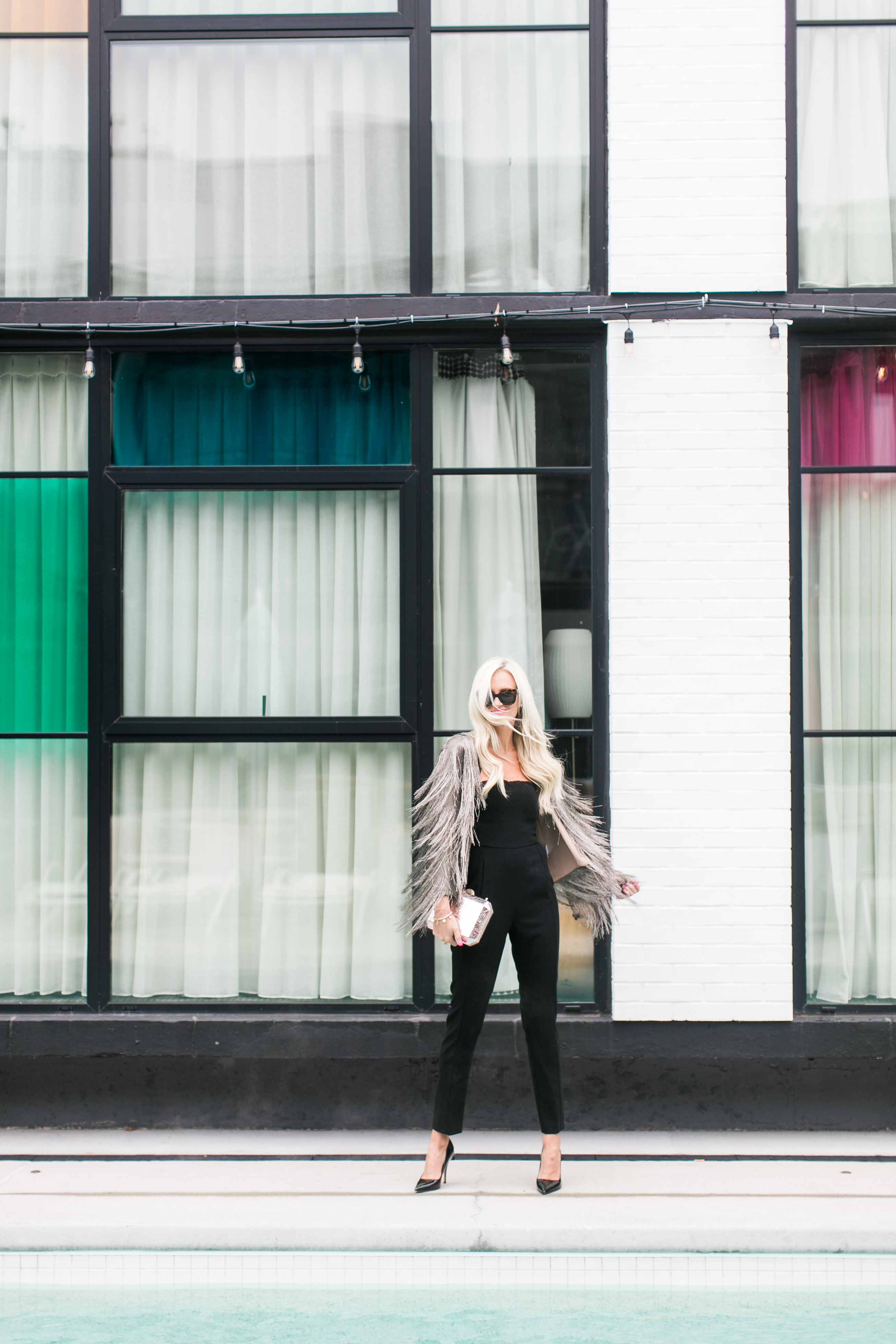 Black Halo Jumpsuit c/o | Rachael Zoe Jacket | Kate Spade Pumps c/o | Celine Sunglasses | Lulus Clutch