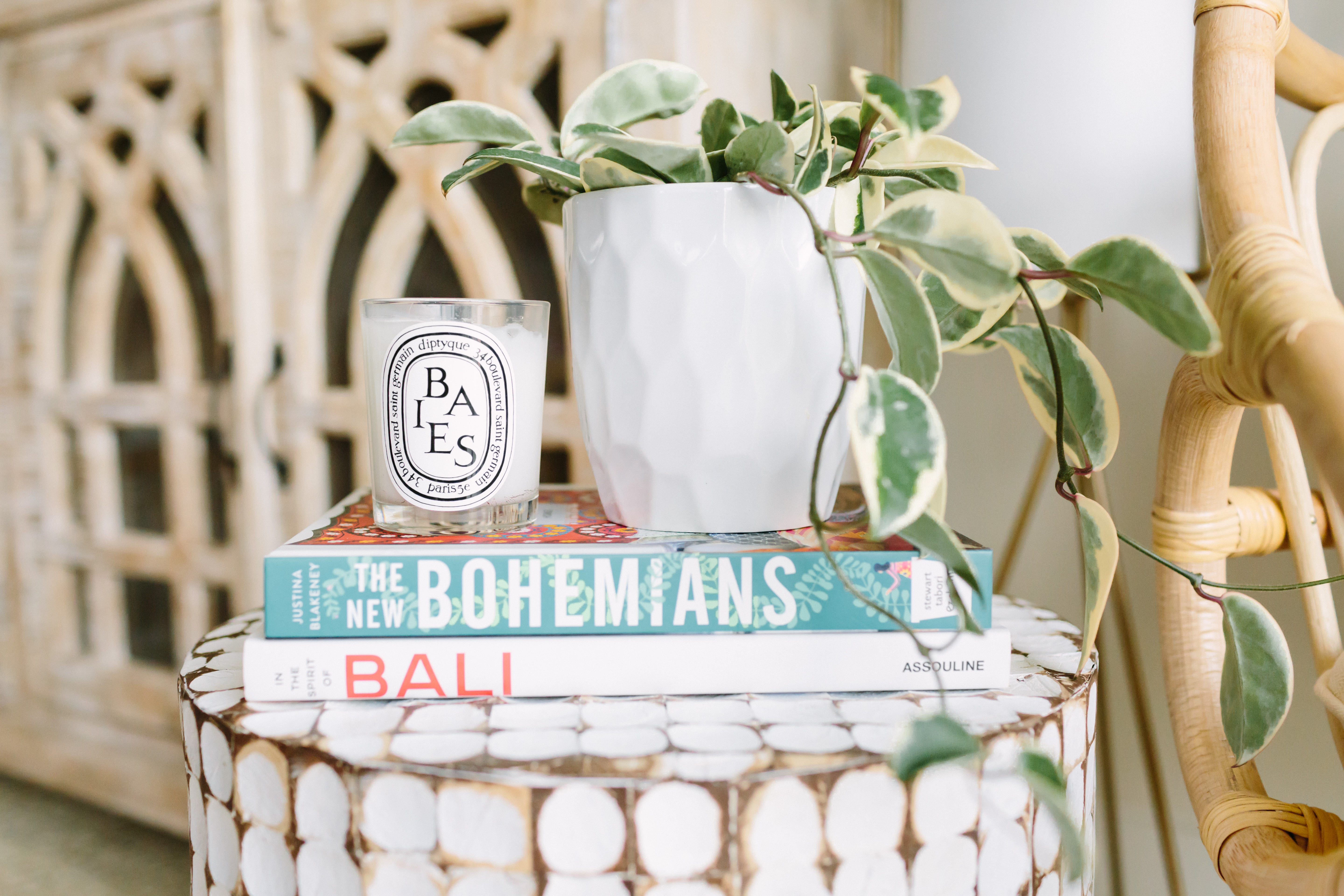 World Market Rug | World Market Rattan Chair | Joss & Main Entertainment Center | Similar Joss & Main Stool | World Market Cactus Art | Bali Book | Bohemians Book | Candle | Mud Cloth Pillow | Circle Ring Planter | Mint Planter | Anders Ruff Stay Wild Sign | Moon Dream Catcher | Home Goods Standing Planter