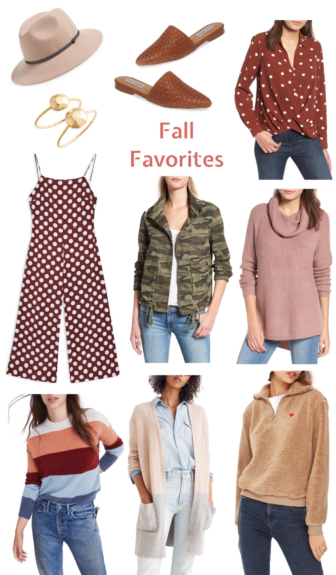 Felt Hat | Tan Leather Flats | Polka dot Blouse | Gold Rings | Polkadot Jumpsuit | Camo Jacket | Mauve Sweater | Striped Sweater | Two toned Cardigan | Teddy bear Zip up