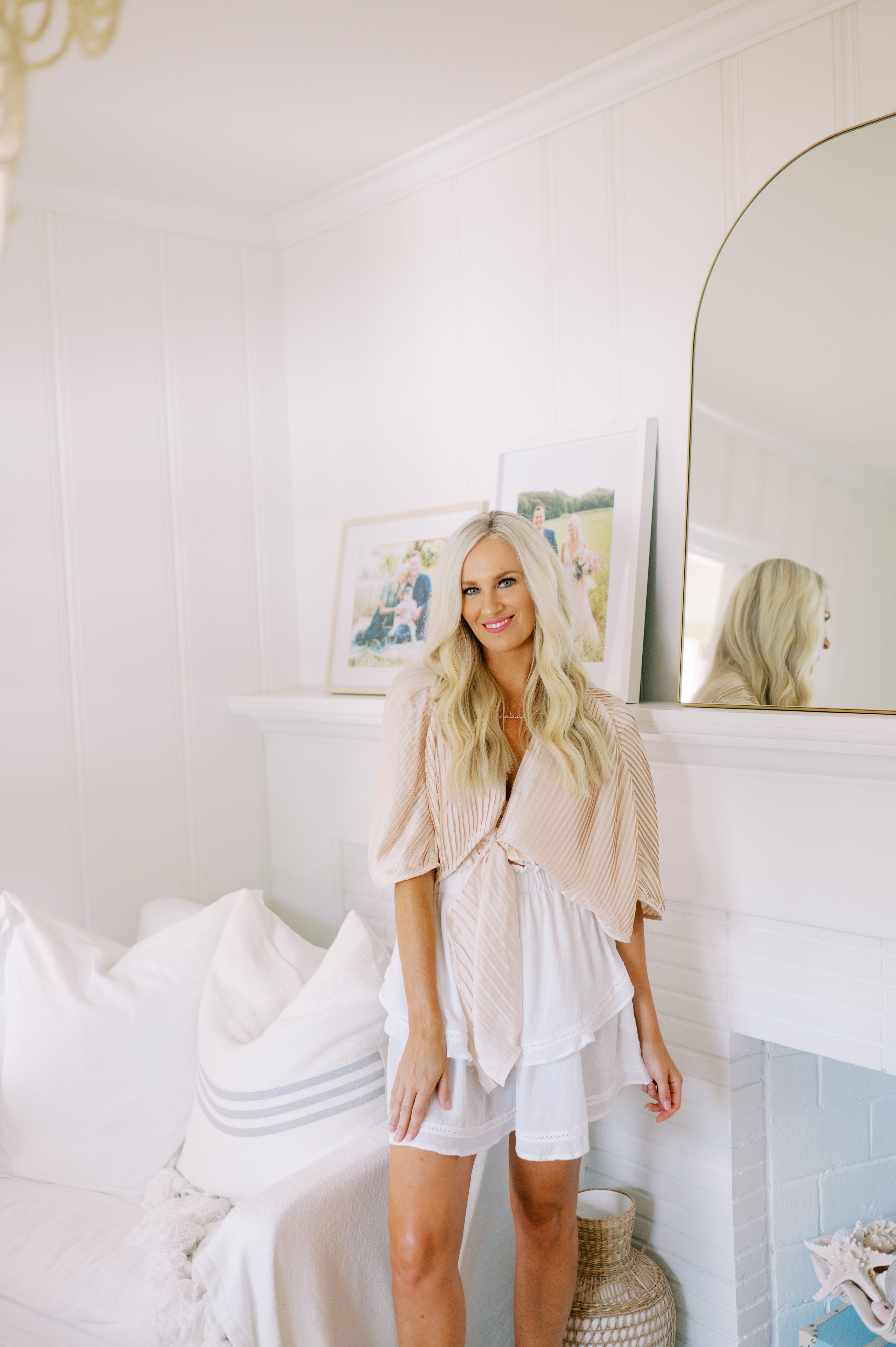 This champagne pleaded tie front top keeps this look feminne and neutral. Another great option to layer over your favorite dress or pair of jeans.